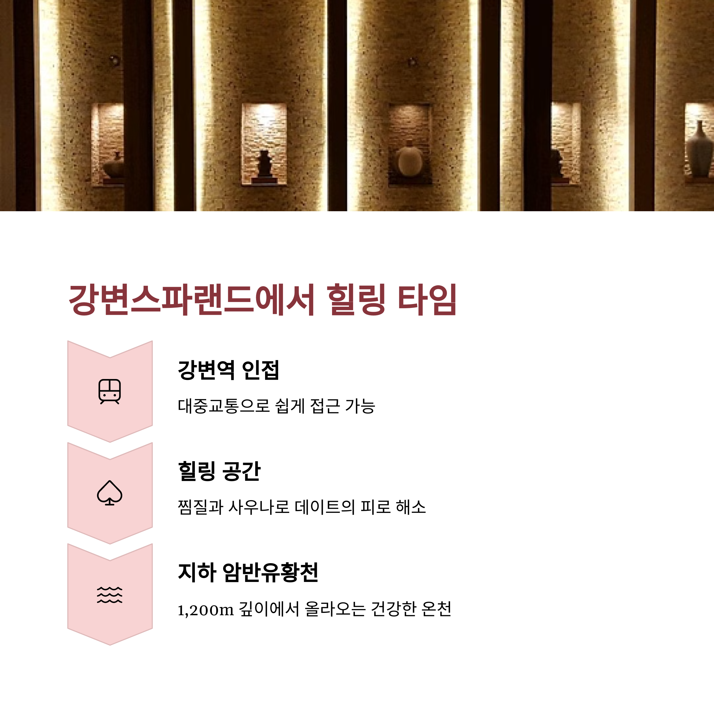 저녁에는 강변스파랜드에서 마무리하는 데이트가 좋습니다. 지하 1,200m 암반에서 끌어올린 유황천은 피로를 말끔히 풀어주며, 다양한 찜질 테마와 불가마, 수면방, 매점까지 모든 요소가 갖춰져 있습니다. 24시간 운영되기 때문에 시간에 구애받지 않고 늦은 밤까지도 여유롭게 즐길 수 있는 것이 큰 장점입니다. 찜질 후 식사까지 마무리하면 하루 종일 알찬 데이트가 완성됩니다. 서울 도심 속에서 찾을 수 있는 최고의 힐링 공간입니다.