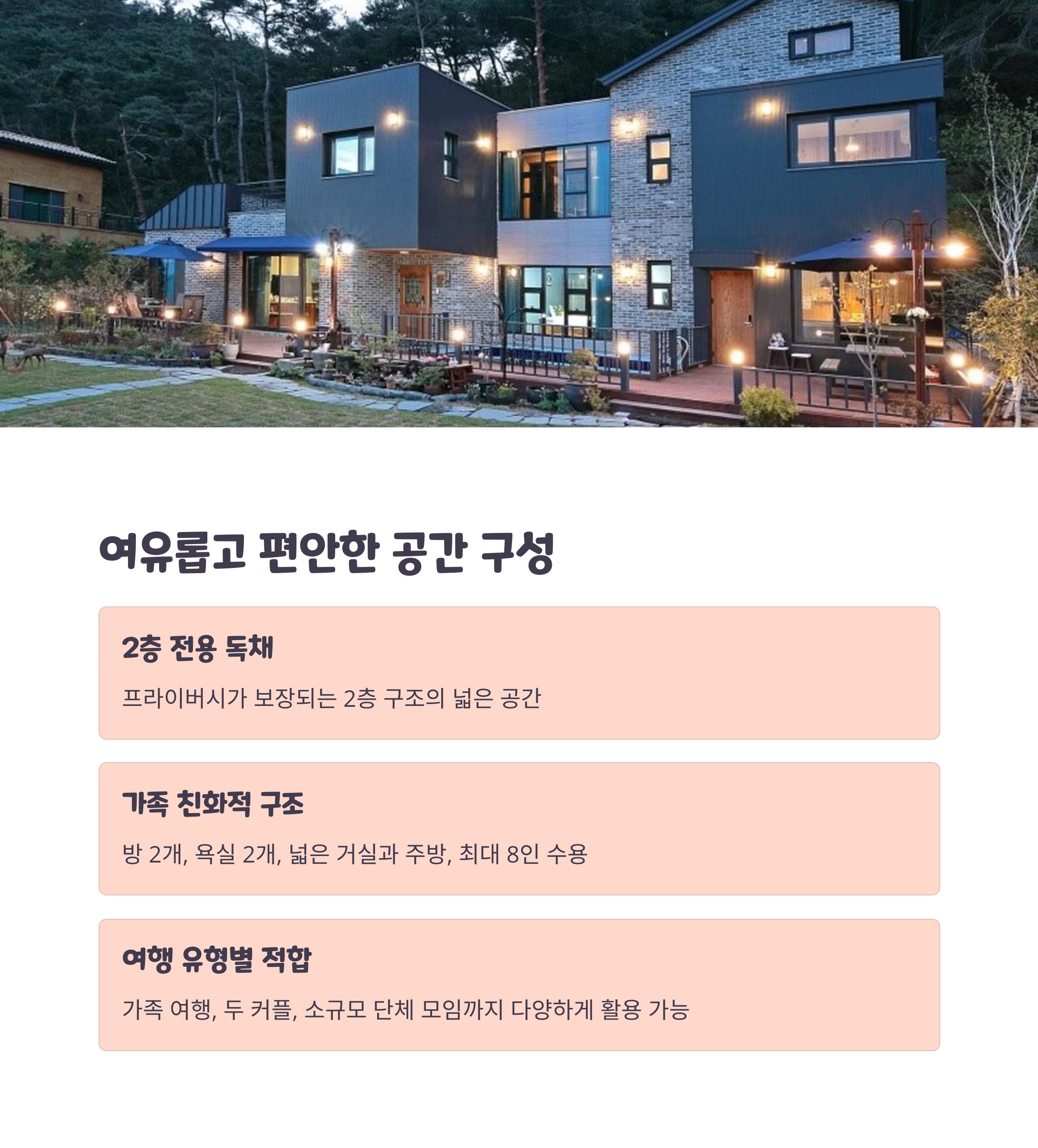 | 구성 | 2층 독채 / 방 2, 욕실 2, 넓은 거실+주방, 개별 수영장 객실 보유 |