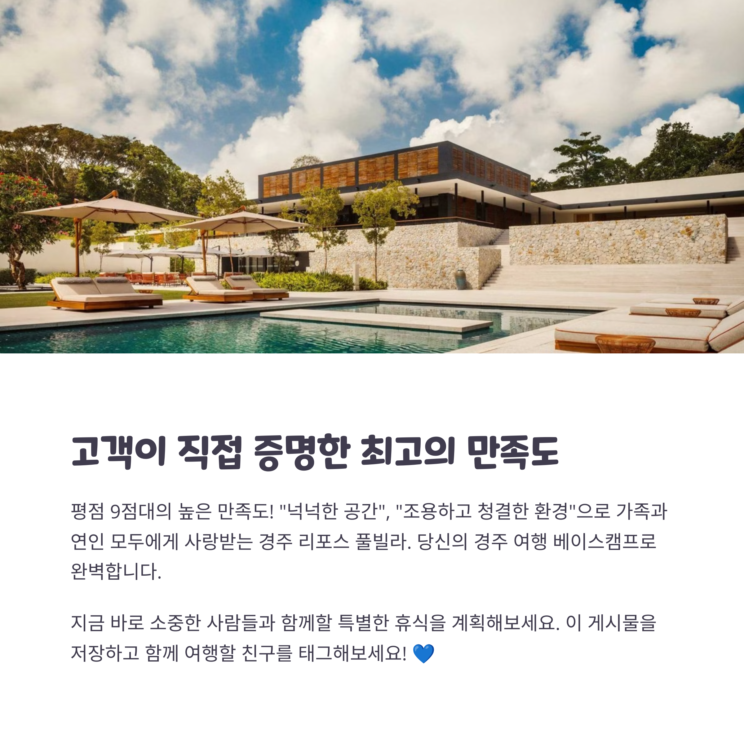경주 리포스 풀빌라는 프라이빗한 독채 공간, 깔끔한 시설, 조용한 자연 속 분위기로 가족, 연인, 친구 누구와 함께여도 만족할 수 있는 숙소였습니다. 체크아웃이 늦어 여유롭게 즐길 수 있고, 수영장, 바베큐 공간, 세련된 인테리어까지 갖춘 이곳은 경주 여행에서 특별한 휴식을 원하신다면 꼭 추천드리고 싶은 곳이에요.