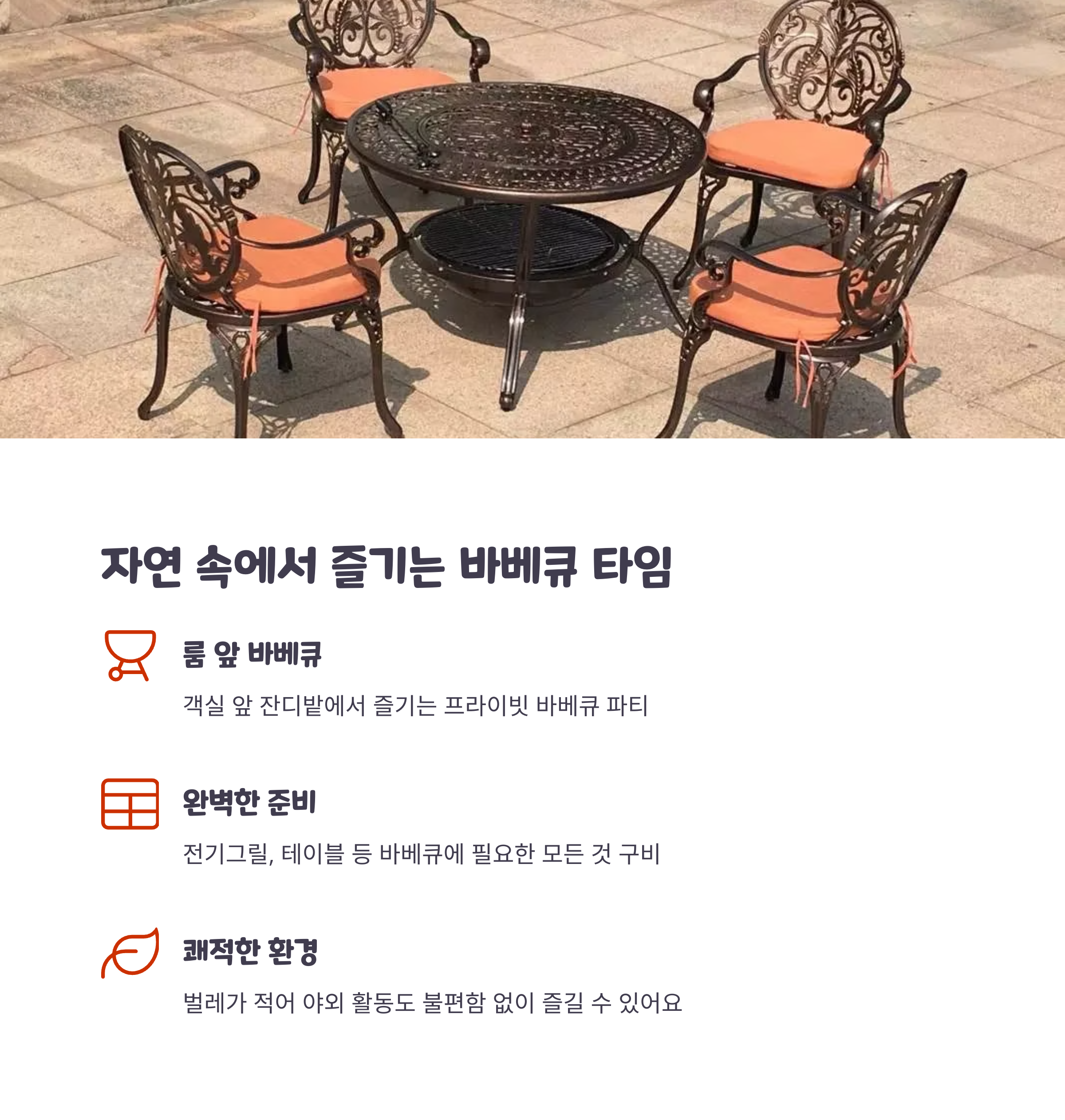 바베큐 시설은 객실 앞 잔디 마당에서 개별로 이용 가능하며, 조명이 켜져 밤에도 분위기 있게 즐길 수 있어요. 벌레가 거의 없어 쾌적한 야외 식사가 가능했고, 도심 숙소에선 누리기 힘든 자연 속 프라이빗함이 인상 깊었습니다. 가족끼리 조용하고 아늑한 시간을 보내고 싶다면 이곳을 추천하고 싶어요.
