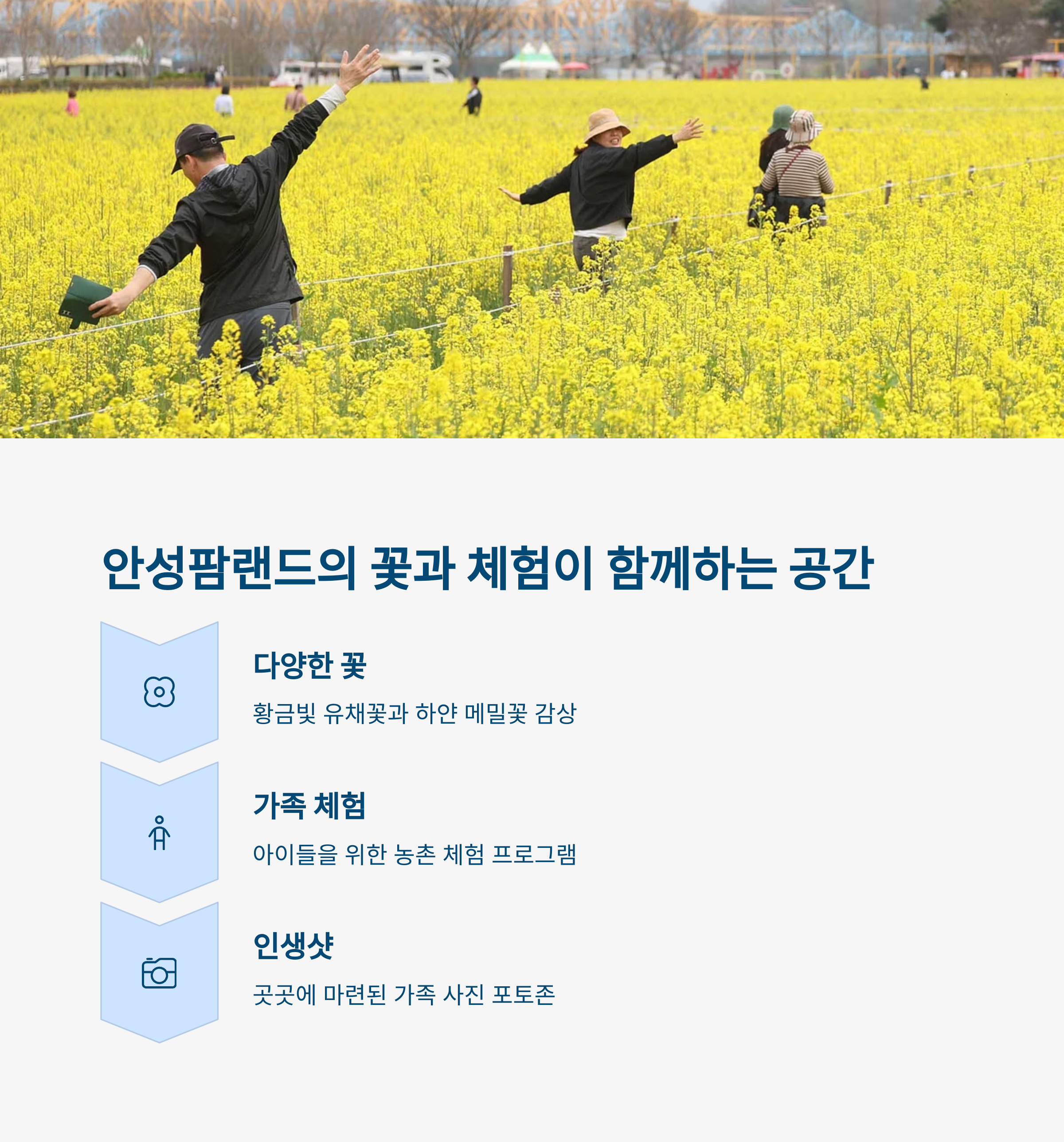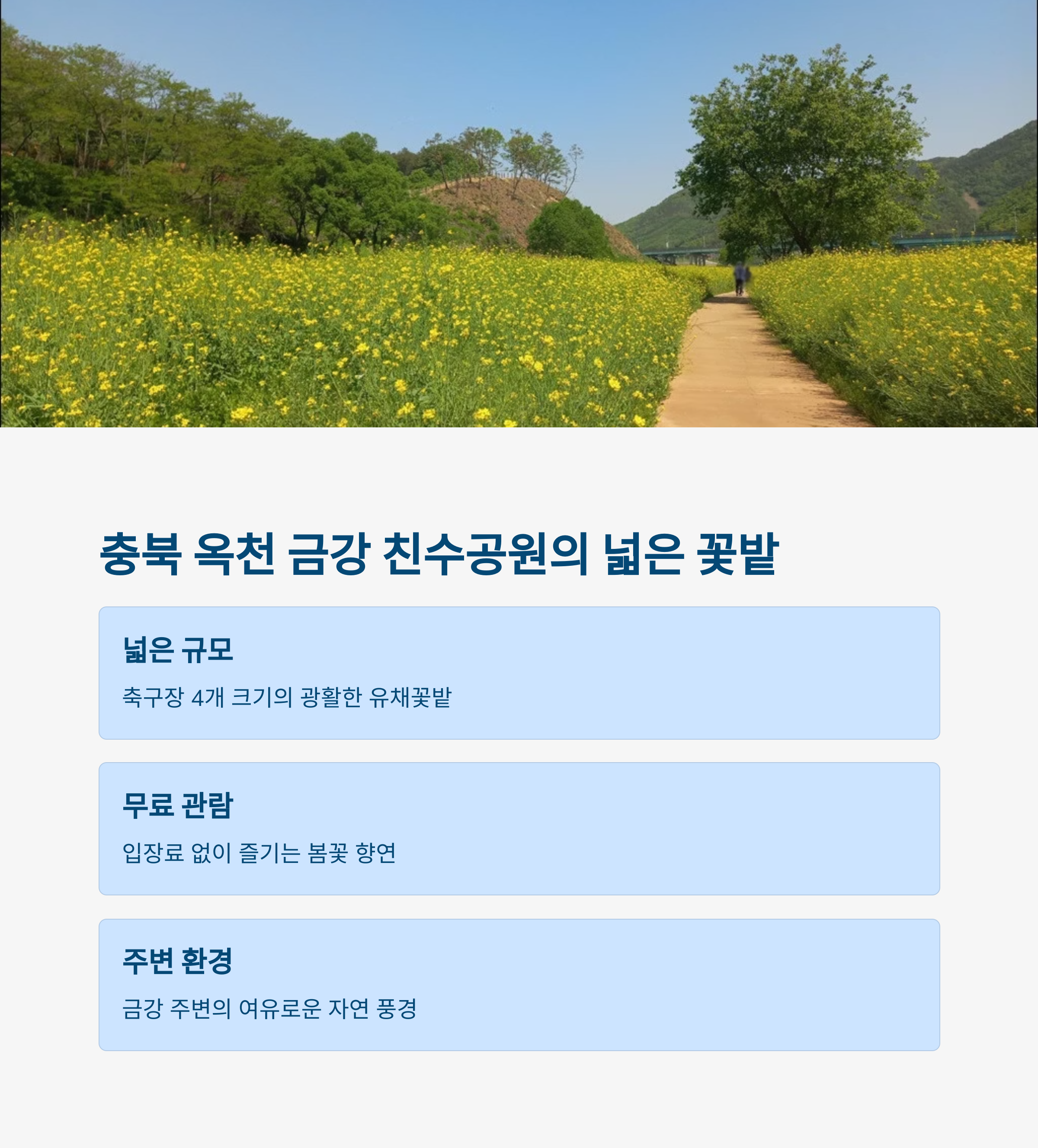 좀 더 넓은 공간에서 여유롭게 꽃을 즐기고 싶다면 충북 옥천 금강 친수공원도 훌륭한 봄나들이 장소예요. 축구장 4개 크기의 유채꽃밭이 무료로 개방되어 있어 가족 단위 방문객에게 인기가 높습니다. 이 외에도 안성팜랜드의 유채·튤립 꽃밭, 남해 다랭이마을의 테라스형 메밀밭 등 지역별 특색을 살린 꽃 명소들이 전국 곳곳에 자리하고 있어요. 봄의 자연을 오감으로 느끼며 가족과 함께 특별한 하루를 만들어보세요.
