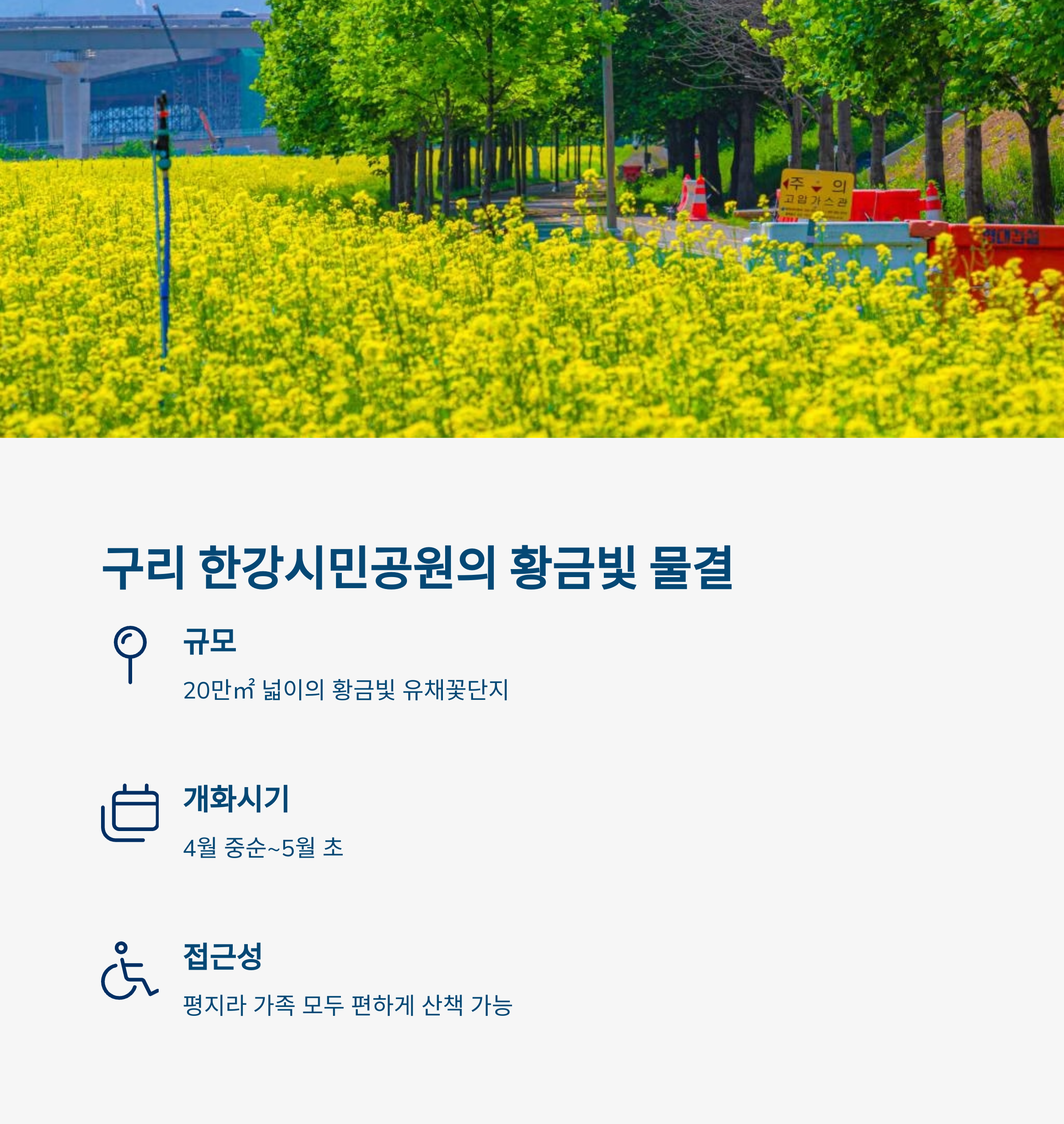 서울 근교에서 유채꽃을 즐기고 싶다면 구리 한강시민공원 유채꽃단지를 추천합니다. 4월 중순부터 5월 초까지 약 20만㎡ 규모의 황금빛 유채꽃밭이 펼쳐지며, 강변을 따라 걷기 좋은 산책길과 포토존도 잘 조성돼 있어요. 특히 어린이와 함께 방문하면 자연학습 효과도 있어 교육적인 나들이로 제격입니다. 접근성도 좋아 대중교통이나 차량 모두 편하게 이용할 수 있어요.