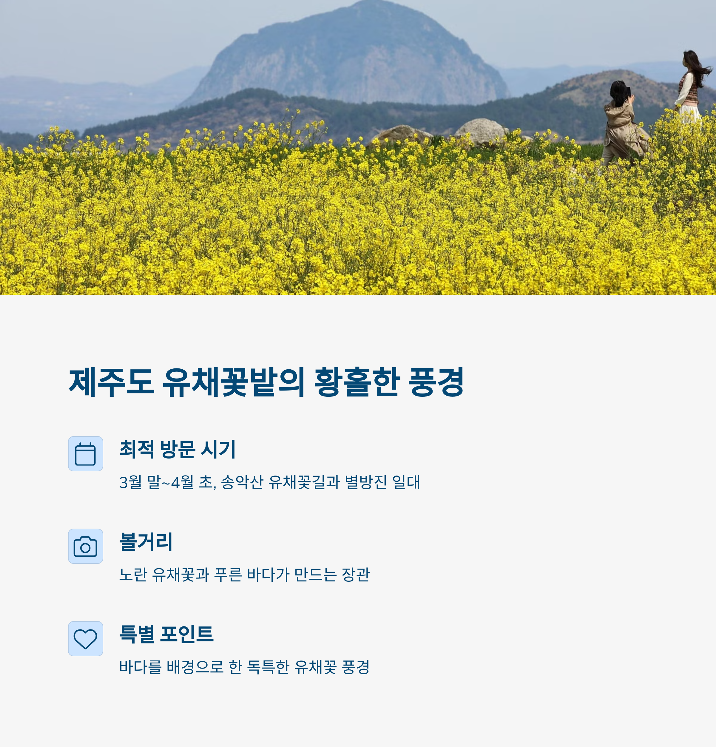 | 제주 유채꽃 명소 | 송악산, 별방진 등에서 유채꽃과 푸른 바다가 어우러진 절경을 감상할 수 있어요. |