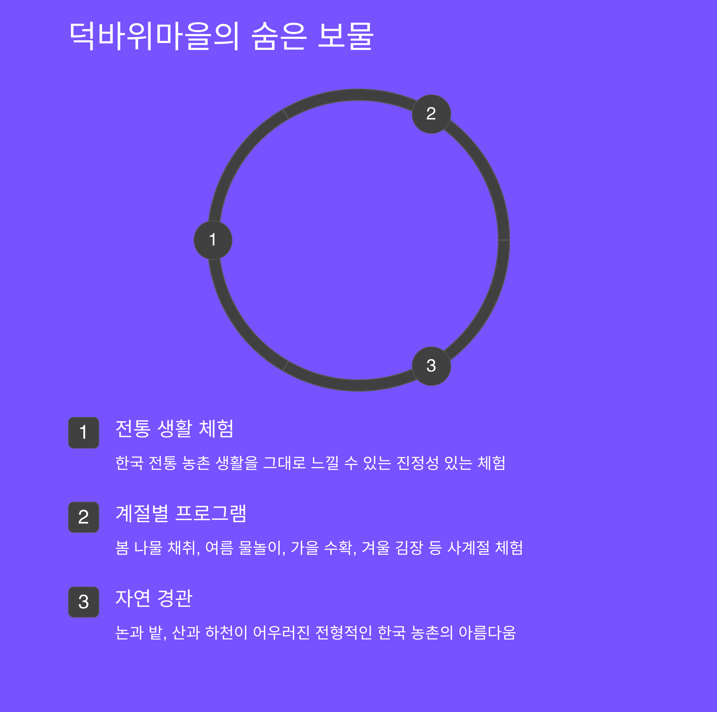 | 체험 프로그램 | 농작물 수확, 전통 음식 만들기, 한복 체험, 자연 탐방, 아이들을 위한 놀이 체험 |