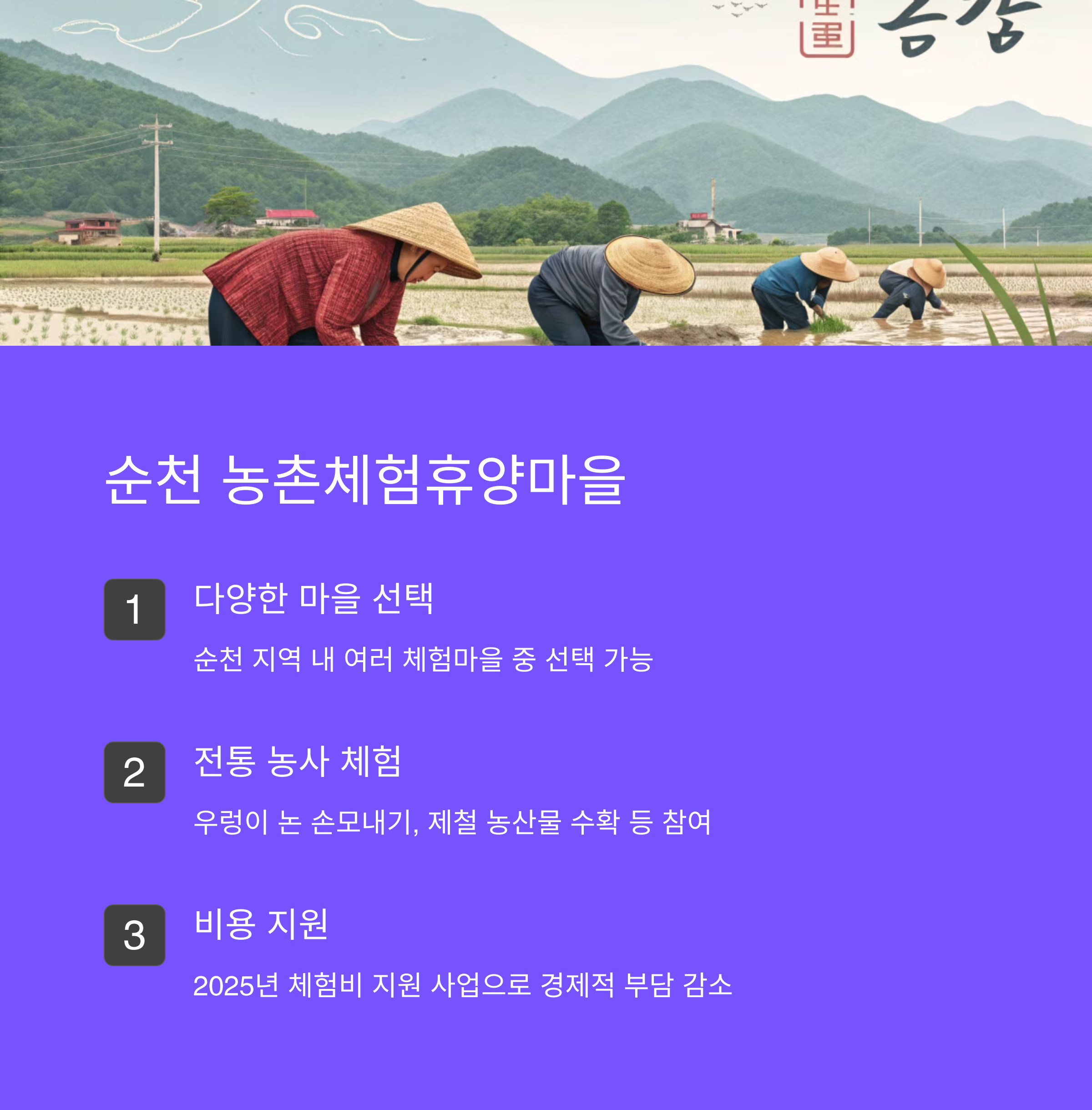 | 추천 여행지 | 담양 꿈에그린농장, 순천 농촌체험휴양마을, 논산 덕바위 농촌체험휴양마을 |