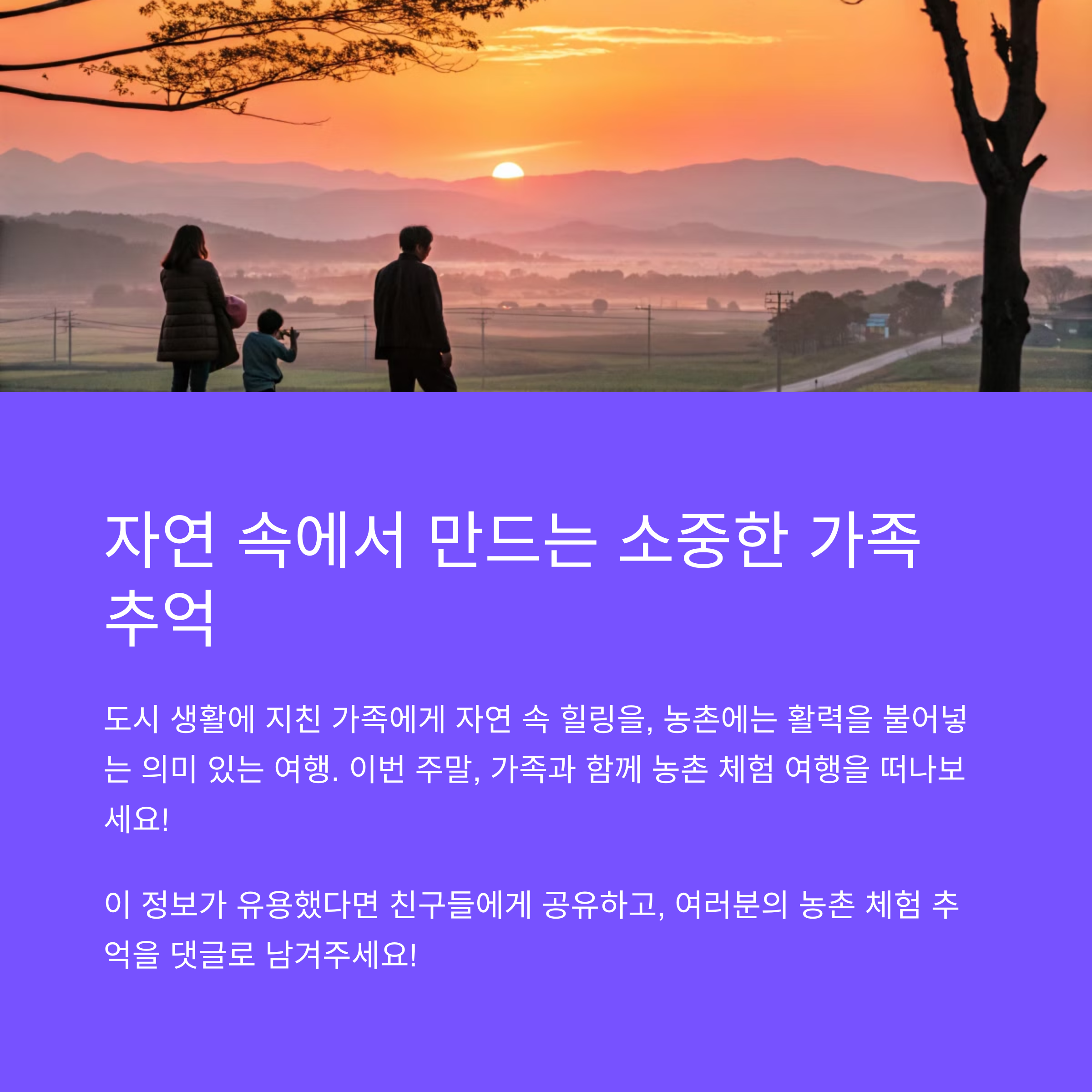 가족과 함께 자연을 느끼고 농촌 생활을 체험할 수 있는 여행지를 찾고 계신가요? 직접 농작물을 수확하고, 전통 음식을 만들며, 한국의 농촌 문화를 경험할 수 있는 주말 농촌 체험 여행지를 추천해 드립니다!