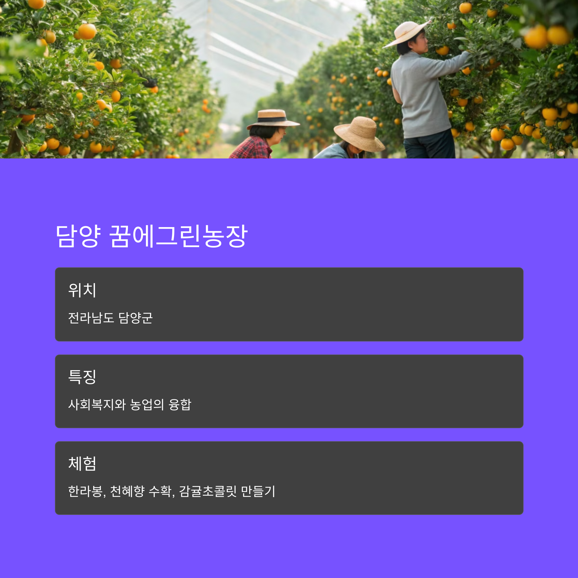 | 담양 꿈에그린농장 | 감귤 수확, 초콜릿 만들기 체험 | 교육적인 농촌 체험 프로그램 |