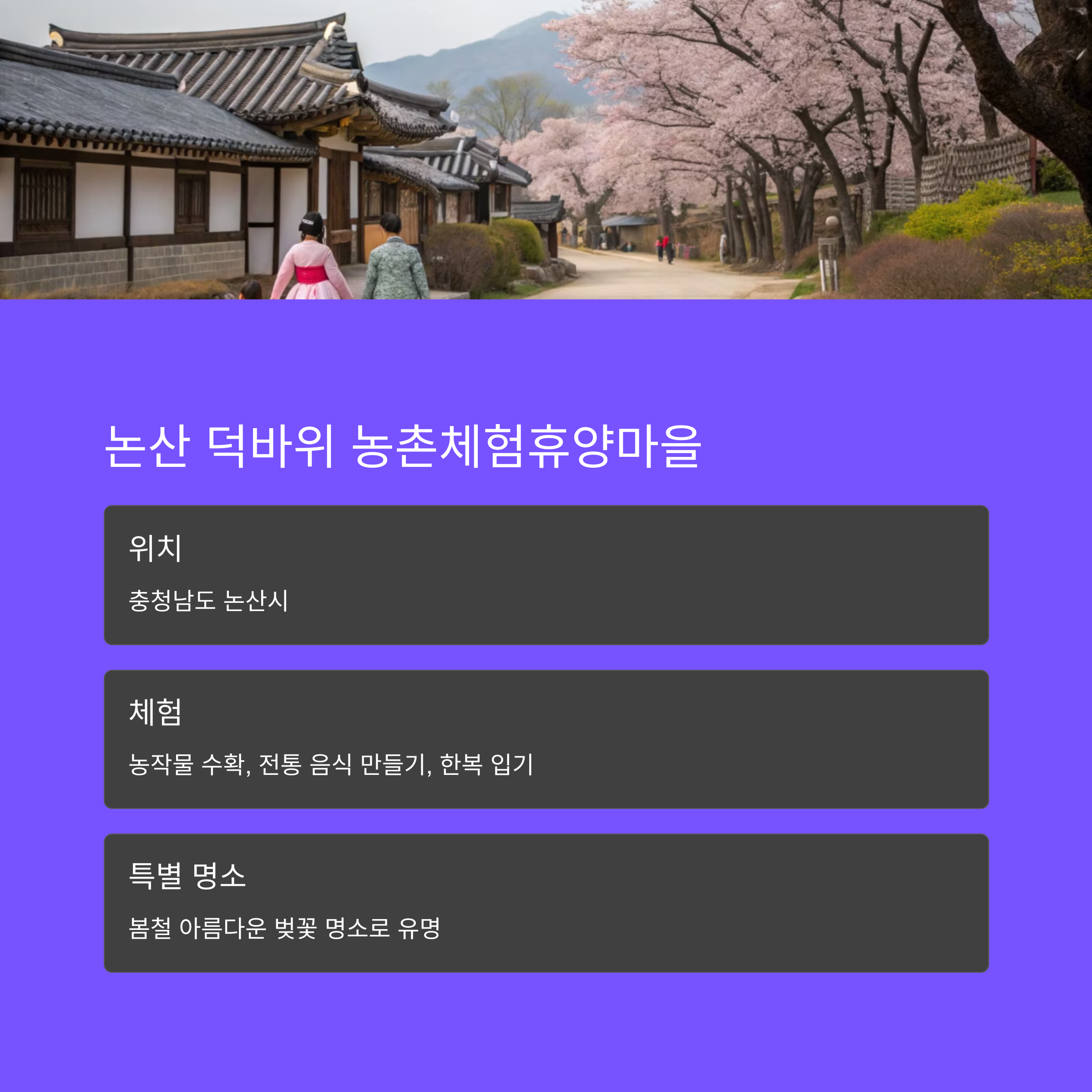 | 논산 덕바위 농촌체험마을 | 농작물 수확, 한복 체험 | 한국 전통 농촌 문화 체험 |