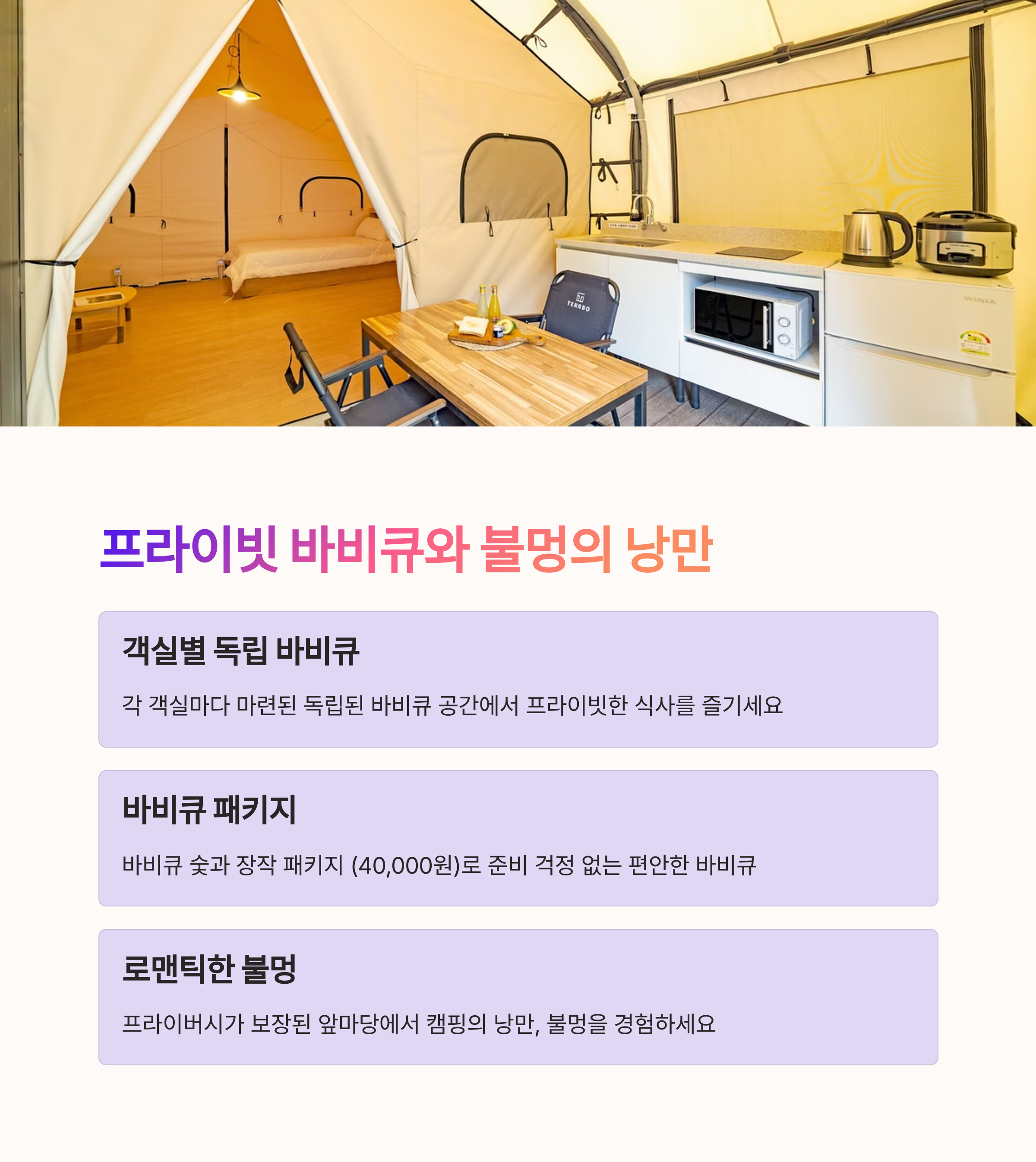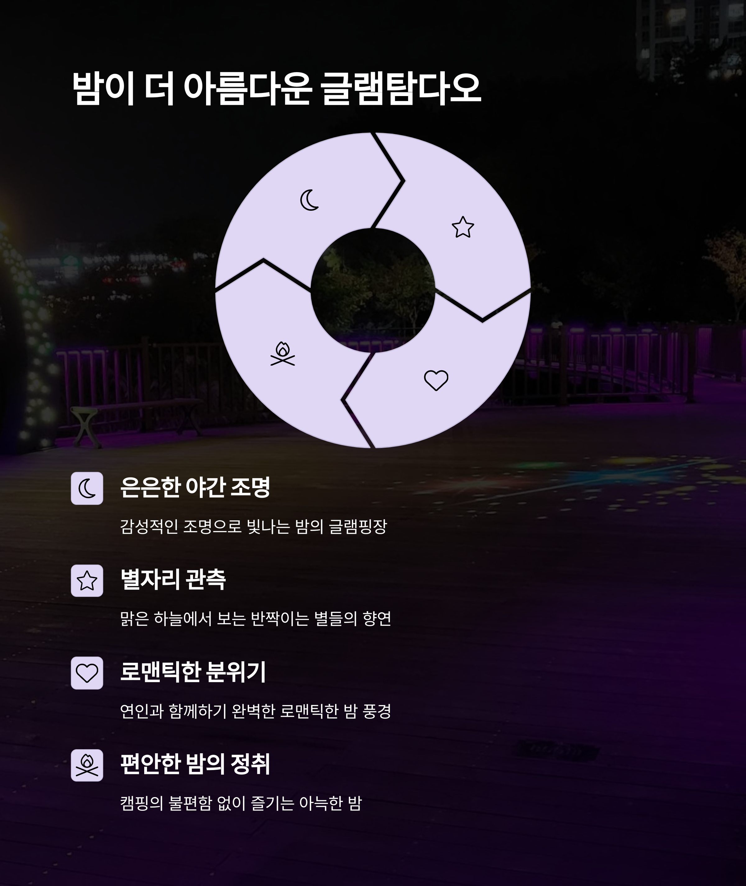 밤이 되면 은은한 조명 아래에서 펼쳐지는 불멍은 글램탐다오의 진정한 하이라이트입니다. 장작이 타는 소리를 들으며 대화를 나누거나, 별자리를 감상하며 하루를 마무리하면 도심에서는 느낄 수 없는 깊은 여운을 경험하게 됩니다. 별도 운영되는 계절별 프로그램은 아이들에게 특별한 체험을 제공하며, 연인과 가족 모두에게 의미 있는 시간을 선물합니다.