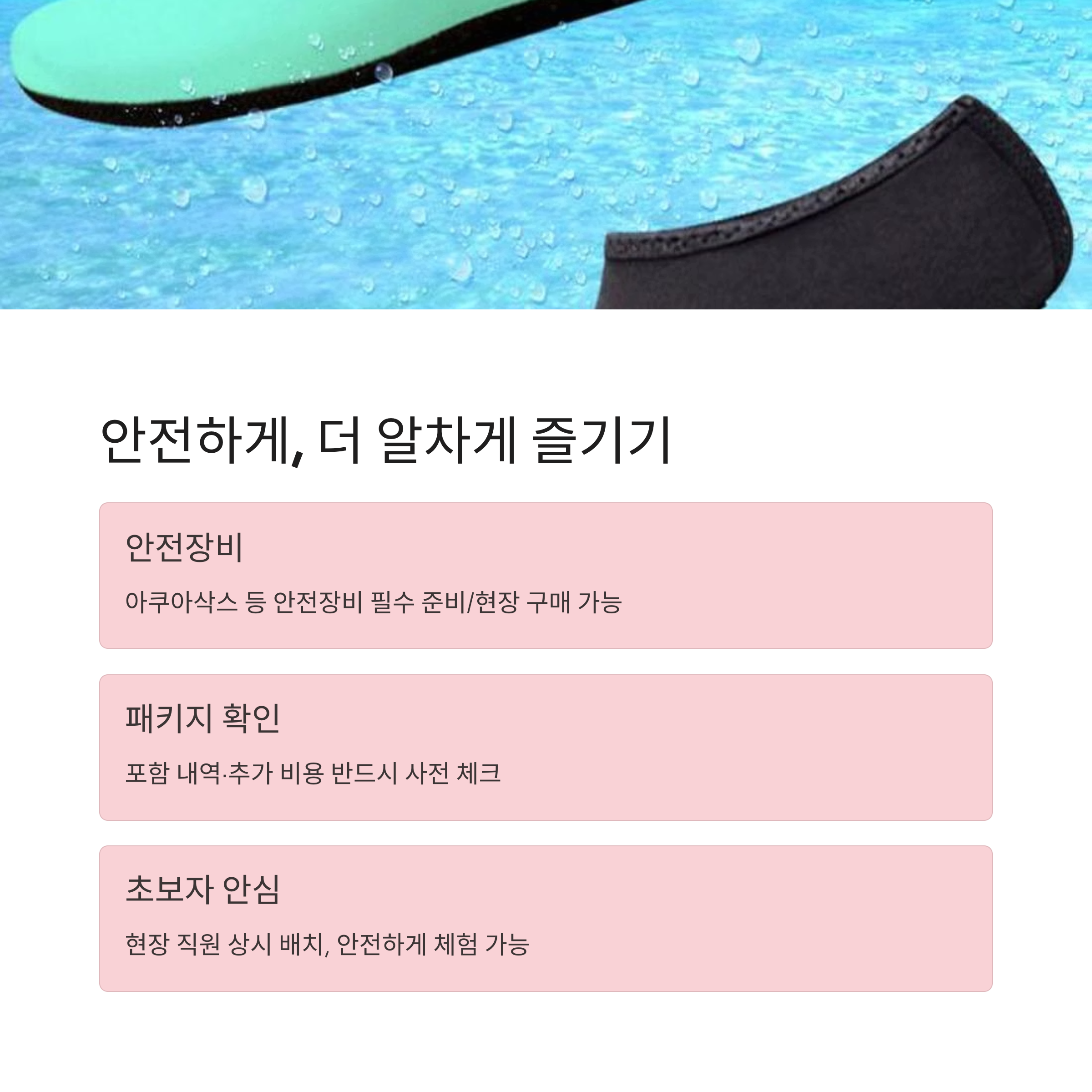 | 초보자도 안심할 수 있는 시설 및 운영 시스템 | 안전장비 필수 지참, 패키지별 포함 내용 체크 | 우천 시에도 운영되는 여름철 인기 여행 코스 |
