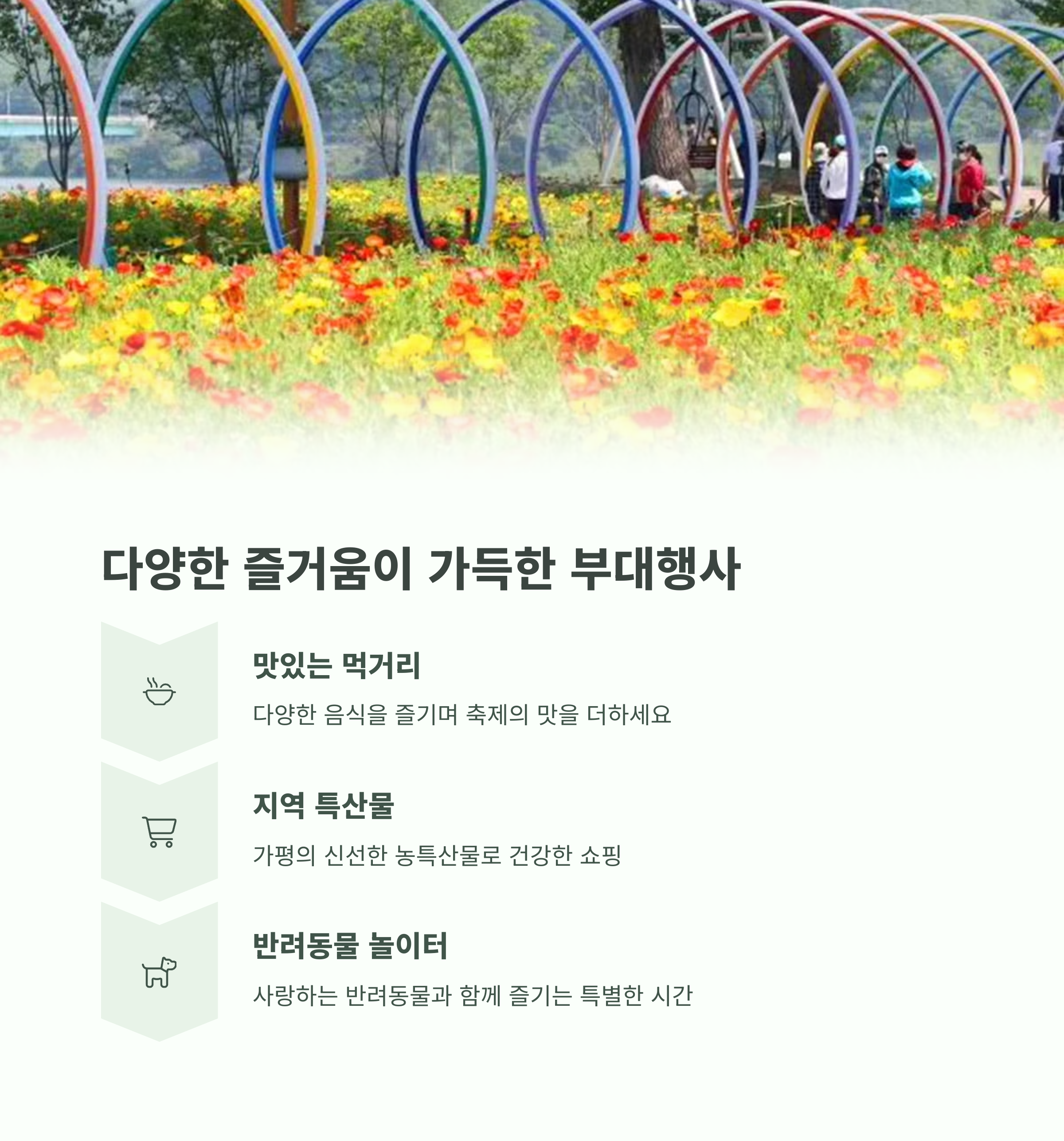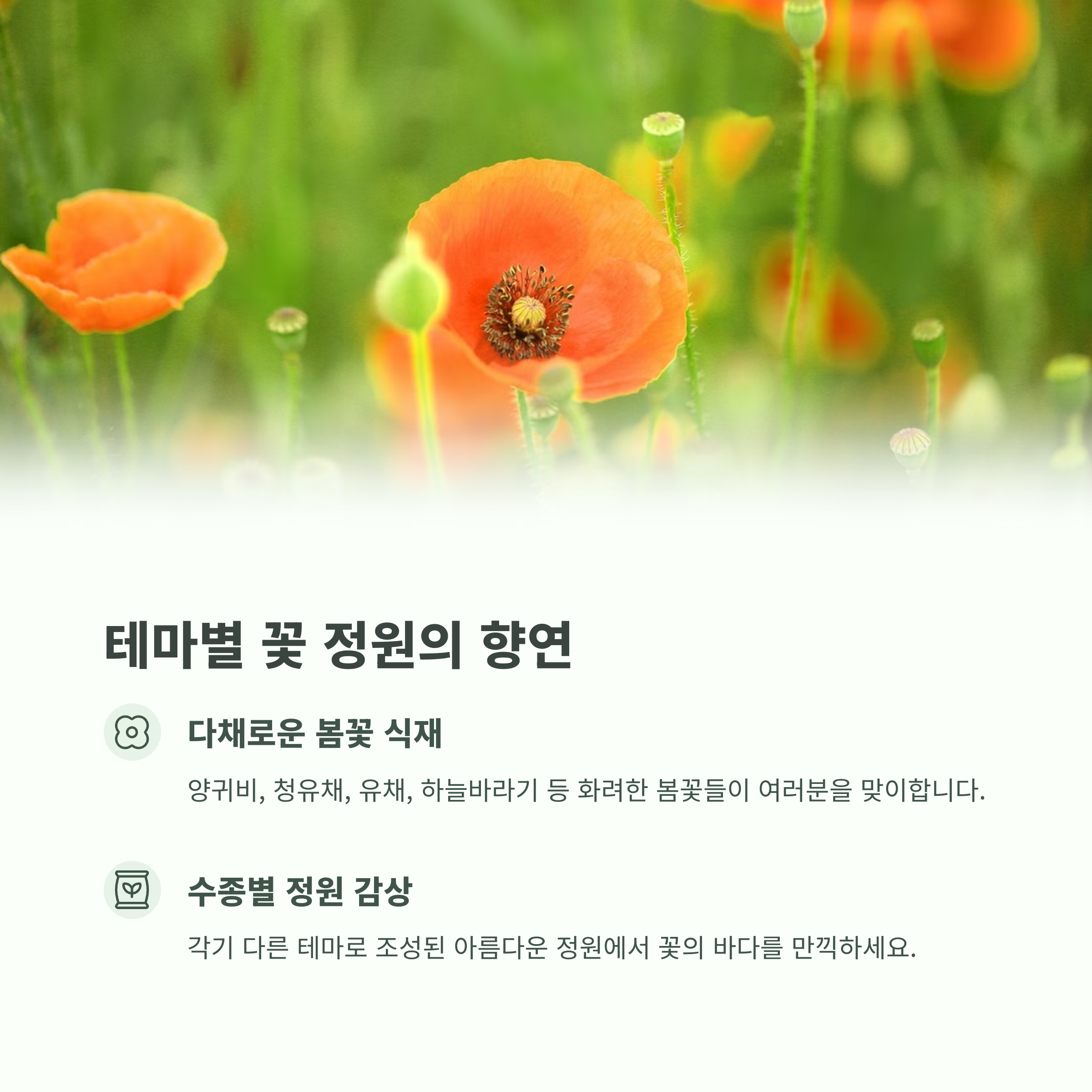 | 매일 오전 10시부터 오후 6시까지 운영 | 각각의 테마에 맞춘 포토존과 산책로 | 연인, 가족, 아이들과 함께 즐기기 좋은 구성 |