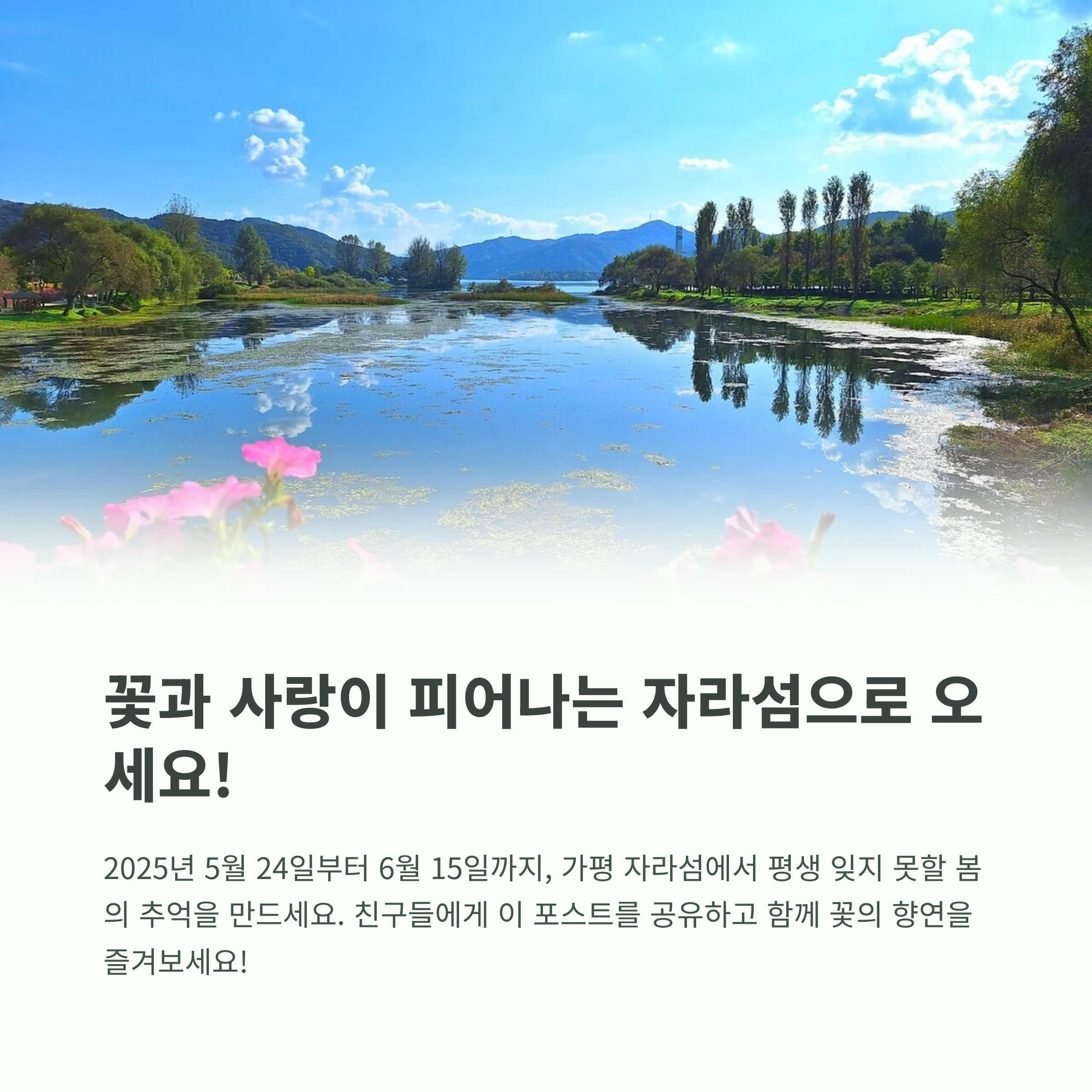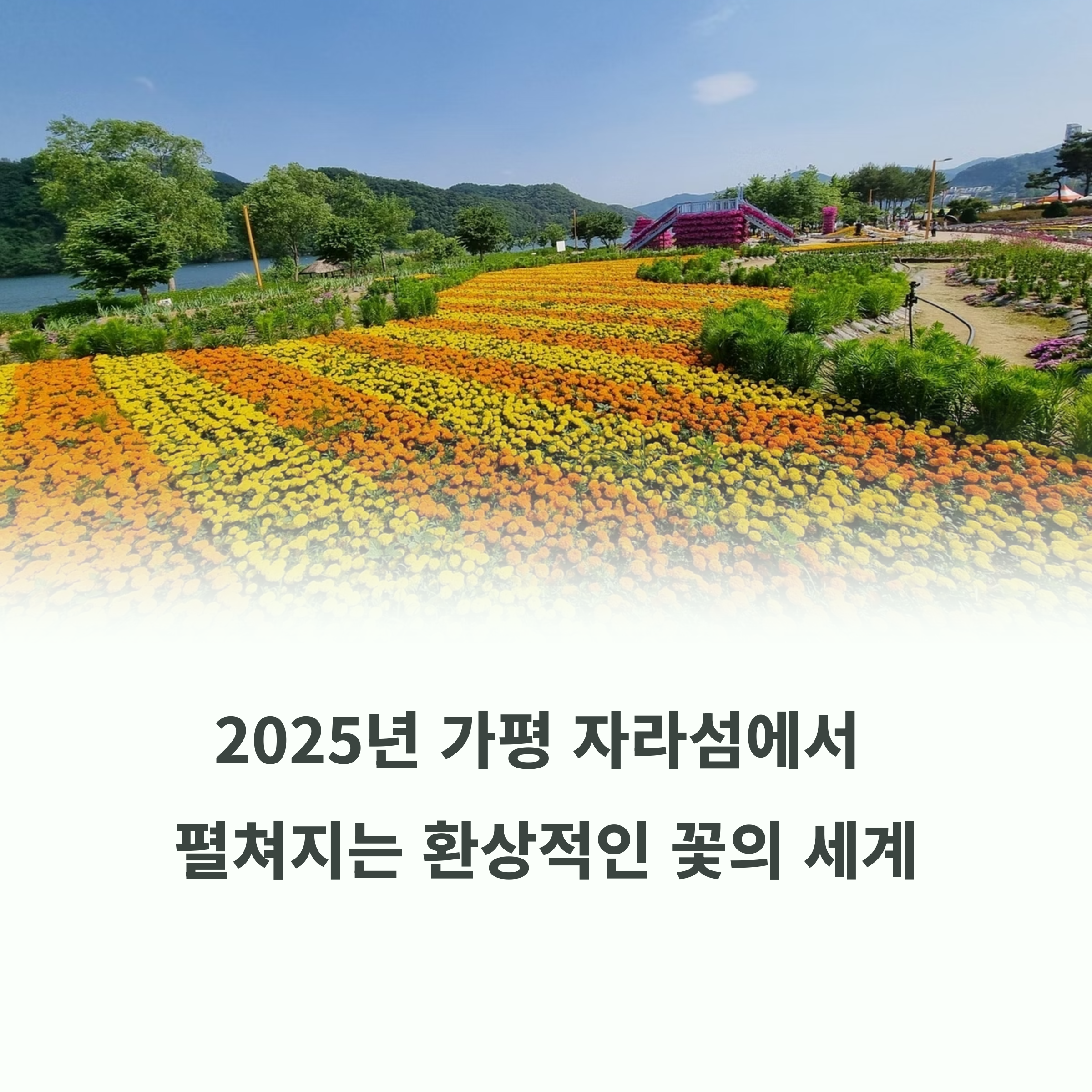 가평 자라섬 꽃축제는 아름다운 자연과 예술, 체험이 조화를 이루는 대표적인 봄철 행사입니다. 다양한 꽃이 선사하는 시각적 즐거움은 물론, 문화 공연과 체험 프로그램을 통해 감성까지 충전할 수 있습니다. 일상의 무게를 잠시 내려놓고 봄의 향연 속으로 떠나보세요. 사랑하는 사람과 함께하는 이 특별한 경험은 오랫동안 기억될 소중한 추억이 될 것입니다.