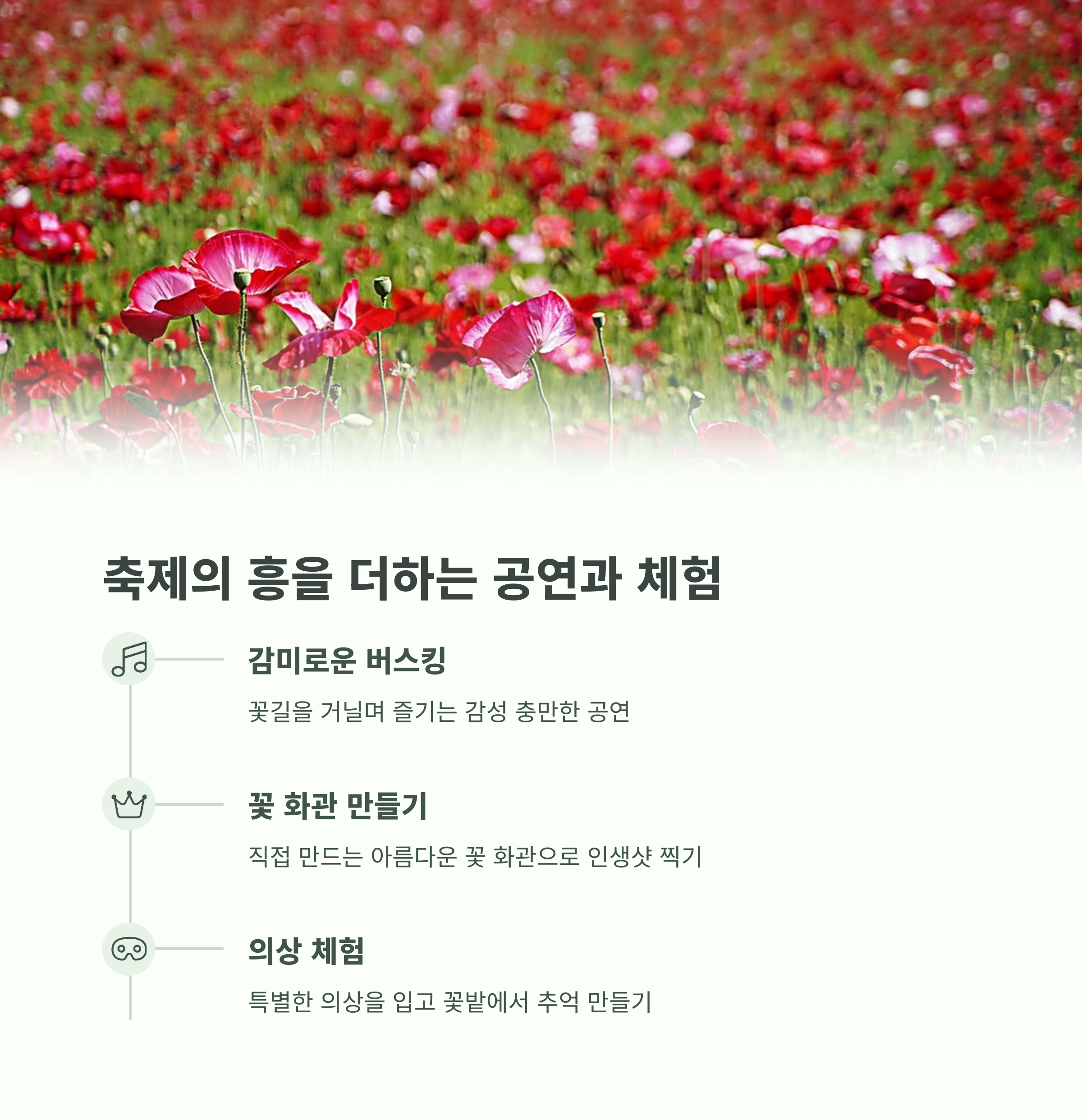 특히 테마별로 구성된 정원들은 이 축제를 특별하게 만들어줍니다. 우정의 정원에서는 따뜻한 감성을, 무지개 정원에서는 다채로운 시각적 즐거움을 만끽할 수 있습니다. 이외에도 자연을 배경으로 한 무대에서 진행되는 버스킹과 밴드 공연은 축제에 생동감을 더해주며, 꽃 화관 만들기 체험은 남녀노소 모두가 좋아하는 인기 프로그램입니다.