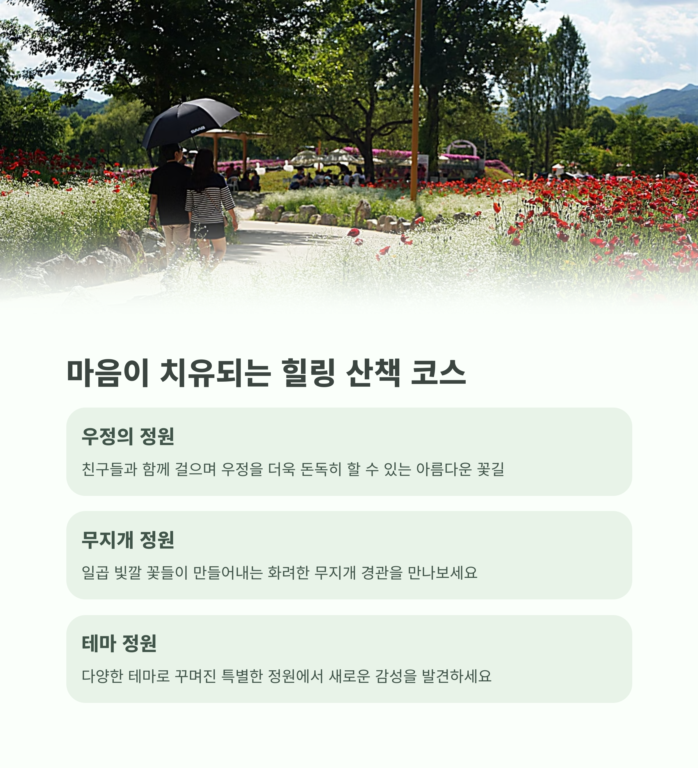 | 매일 오전 10시부터 오후 6시까지 운영 | 각각의 테마에 맞춘 포토존과 산책로 | 연인, 가족, 아이들과 함께 즐기기 좋은 구성 |