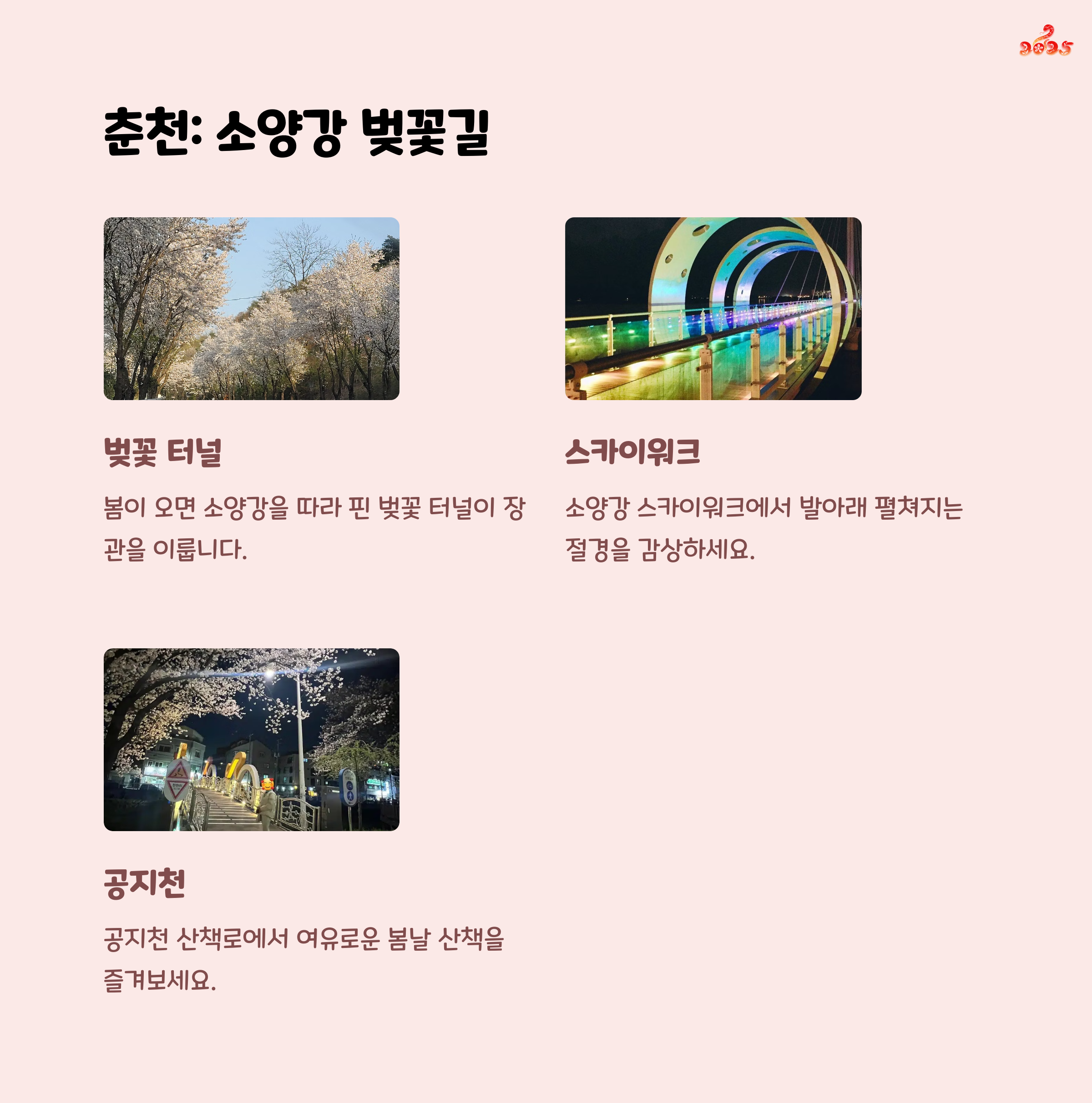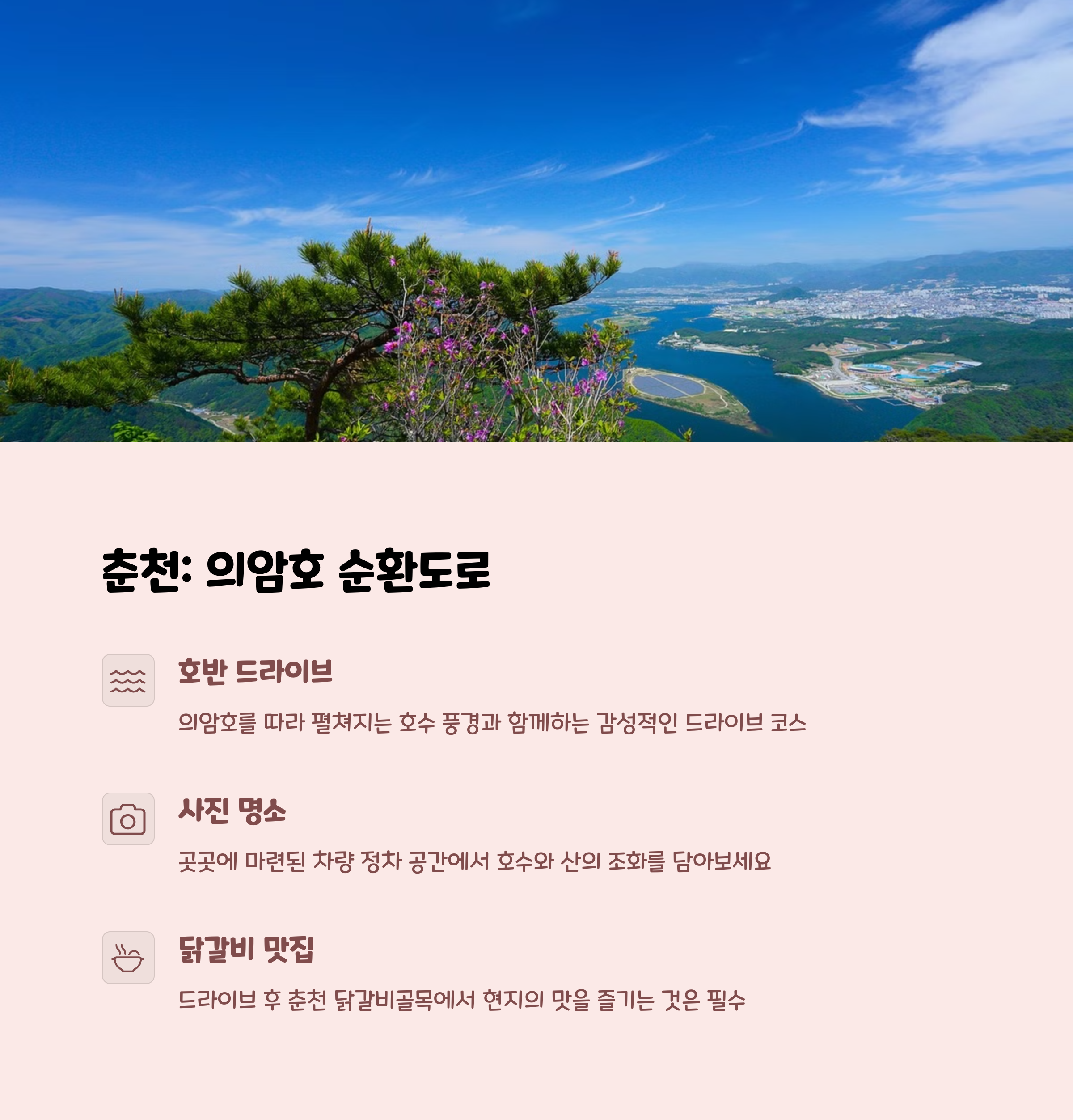 | 춘천 호반 드라이브 | 소양강, 의암호, 남이섬 등 호수와 벚꽃길이 어우러진 감성 코스로 봄철 인기 최고! |