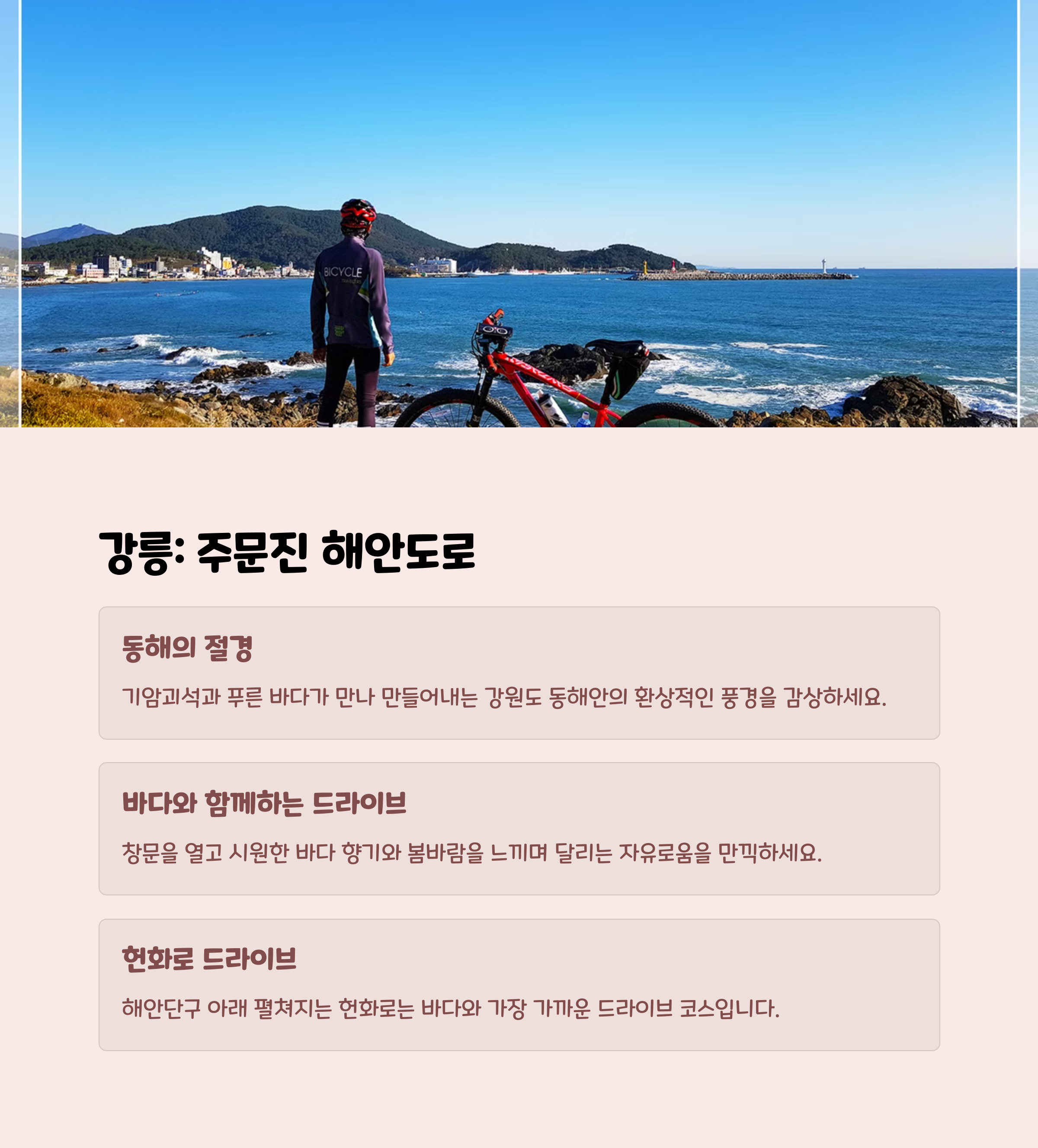 | 드라이브 중 들를 수 있는 로컬맛집과 카페 정리 | 당일치기 or 1박2일 추천 여행 코스로도 적합 | 봄에 꼭 가봐야 할 동해+내륙 드라이브 조합 |