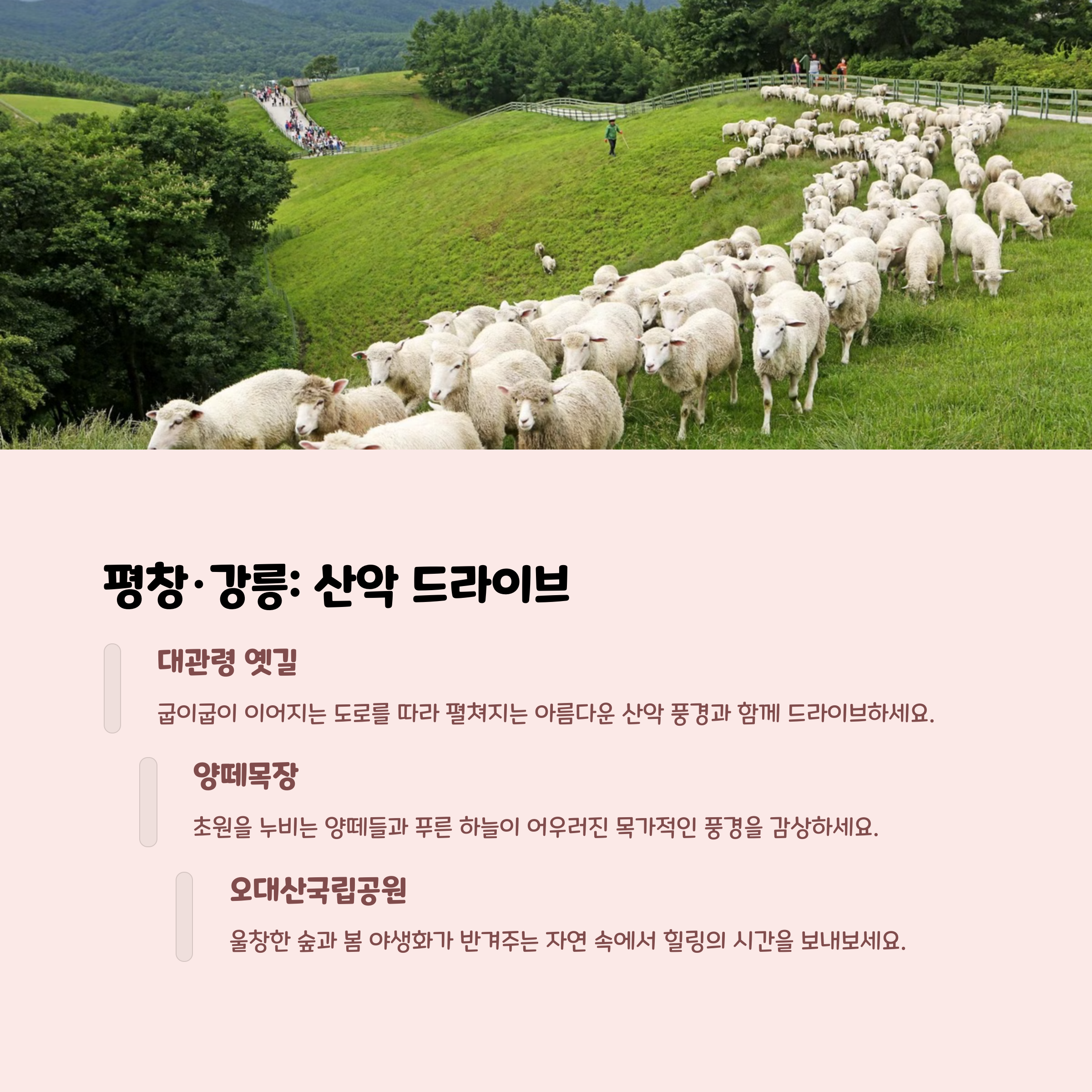 평창~강릉 산악 드라이브도 놓칠 수 없어요. 대관령 양떼목장, 오대산 국립공원은 맑은 공기와 푸른 초원이 인상적이고, 해발이 높아 설경과 봄꽃이 어우러진 풍경을 즐길 수 있어요. 드라이브 코스 중엔 현지 특산물 맛집, 디저트 카페도 다양해 감성·자연·먹거리를 모두 만족시켜주는 여행지랍니다.