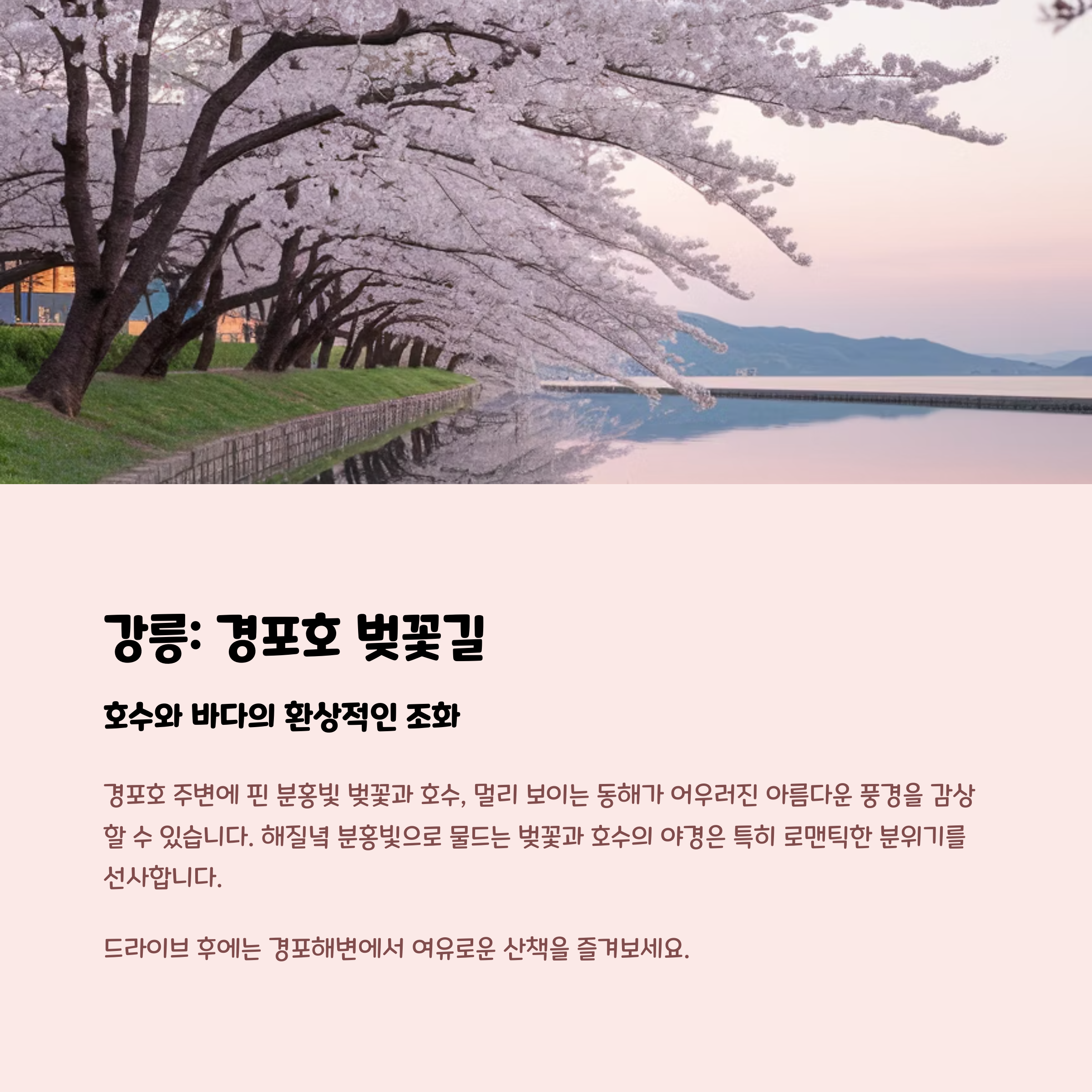 | 경포호, 주문진, 바다뷰 감성 도로 추천 | 소양강 스카이워크, 남이섬 포함한 순환 루트 | 벚꽃길·초록초원·산악풍경까지 모두 담긴 코스 |