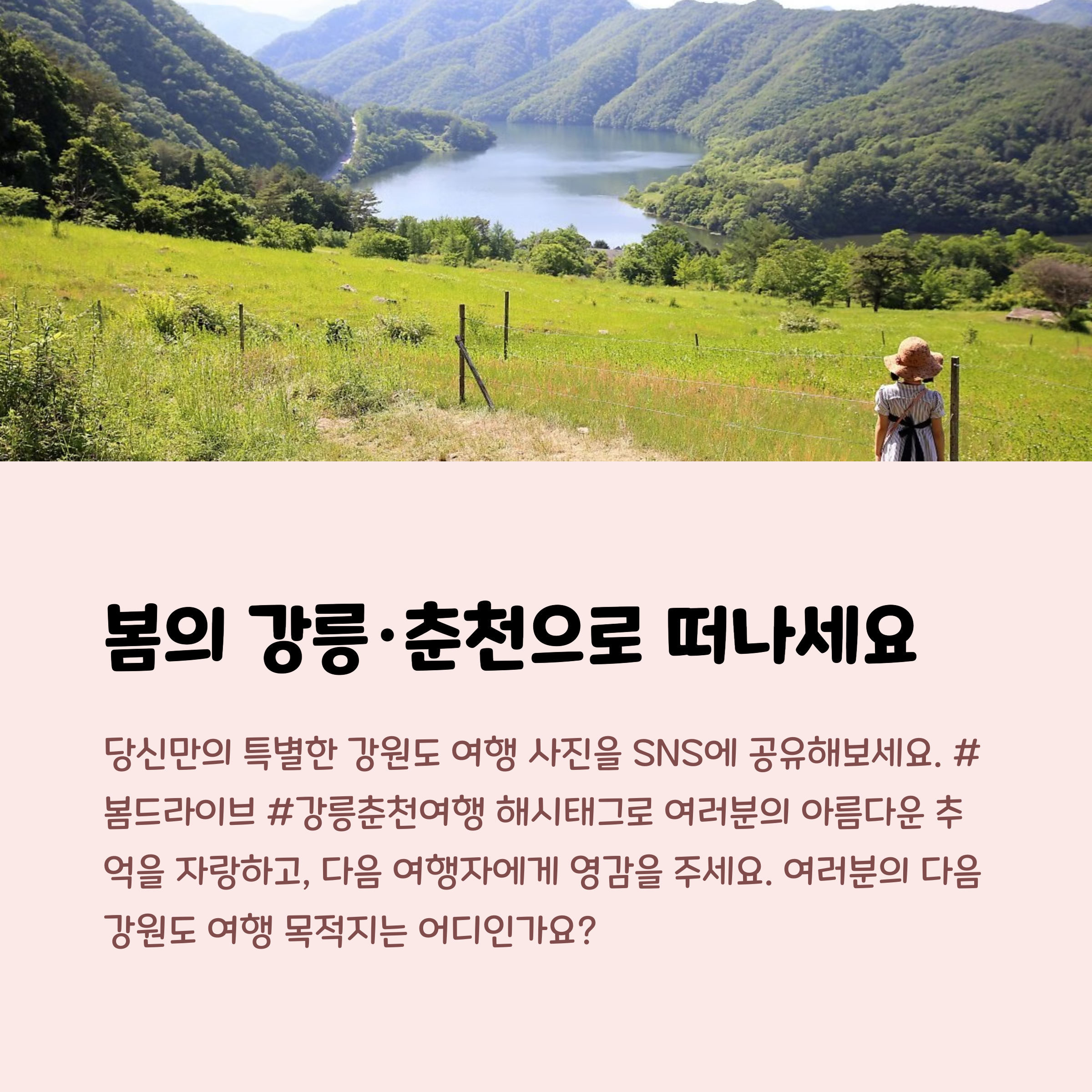 강과 호수, 바다와 산, 그리고 봄꽃까지. 자연이 가득한 강릉·춘천 드라이브는 누구와 함께 떠나도 만족도 100%의 봄 여행이 될 거예요. 오늘 소개한 코스를 참고해서, 이번 주말엔 햇살 따라 가볍게 떠나보세요 🚗🌸🌊
