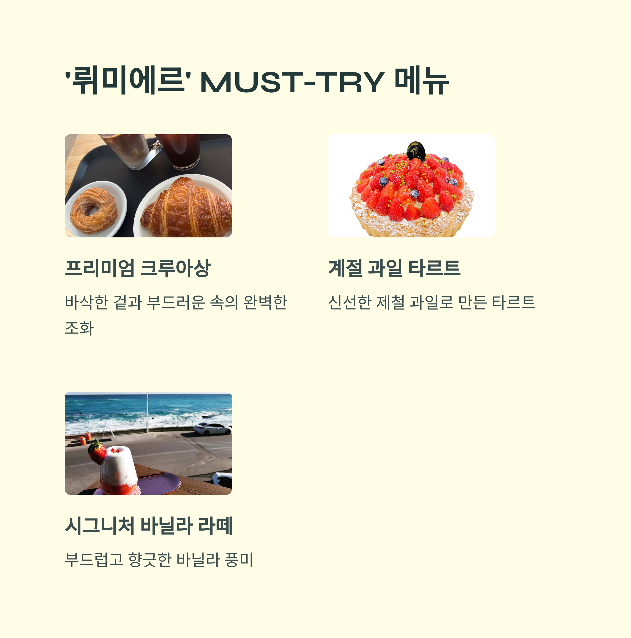 두 번째는 감성 인테리어가 매력적인 카페 뤼미에르입니다. 자연광이 가득 들어오는 아치형 창과 따뜻한 톤의 인테리어는 들어서는 순간부터 마음을 편하게 해주는 공간이에요. 크루아상, 에그타르트, 케이크 등 디저트 구성도 개성 있고 고급스러워 카페 자체가 하나의 포토존처럼 느껴지죠. 커피뿐만 아니라 티류도 훌륭해 다양한 취향을 만족시켜 줍니다.