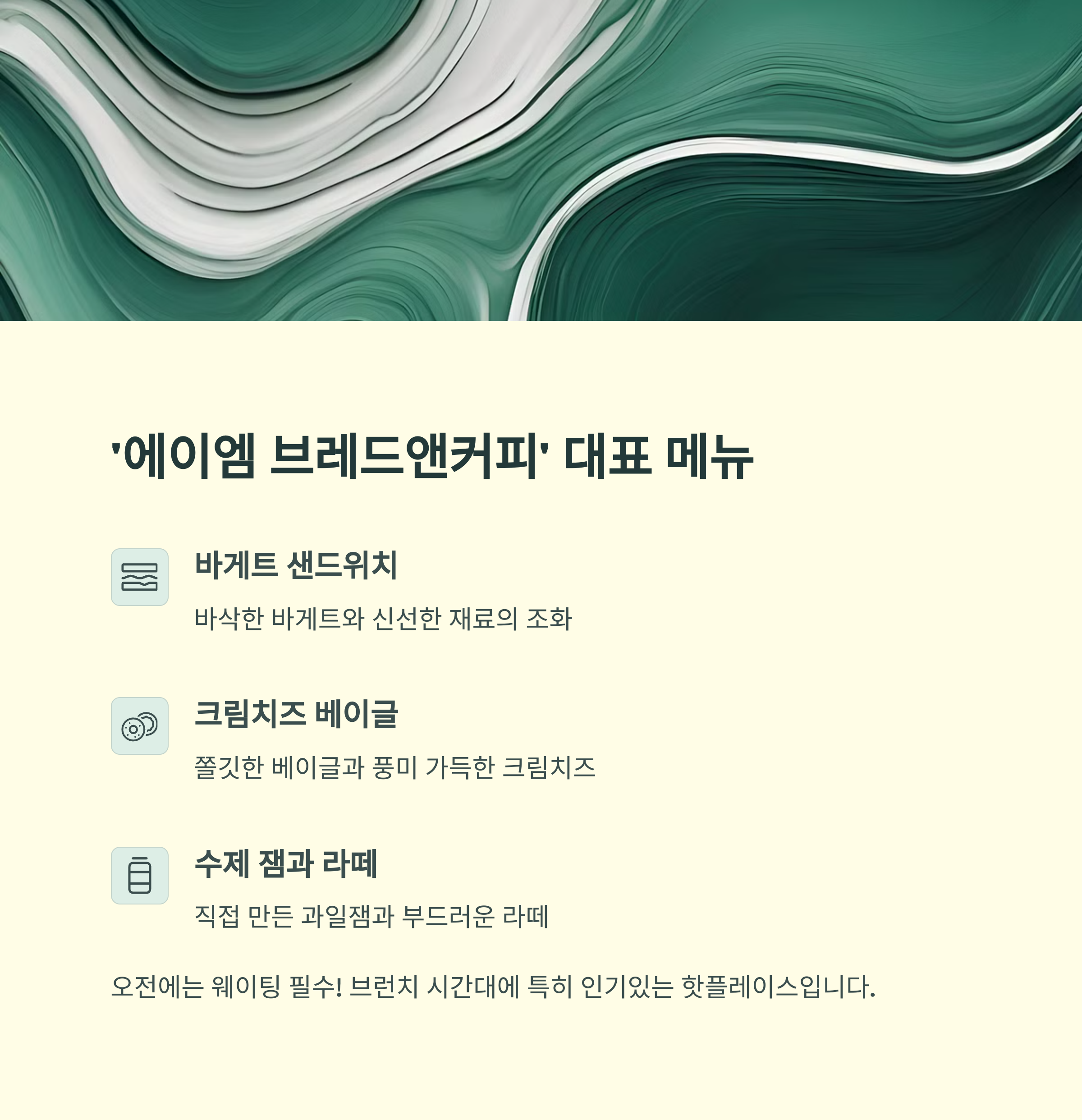 마지막은 에이엠 브레드앤커피. 내곡동 주택가에 위치한 로컬 감성 베이커리 카페로, 갓 구운 크루아상과 포카치아가 인기 메뉴입니다. 프렌치 토스트 스타일의 브런치 세트도 인기이며, 모던한 실내 인테리어와 통유리창 너머 풍경 덕분에 아침 시간대 방문객이 많습니다. 조용히 커피 한 잔 하며 일상을 잠시 내려놓기에 딱 좋은 공간입니다.