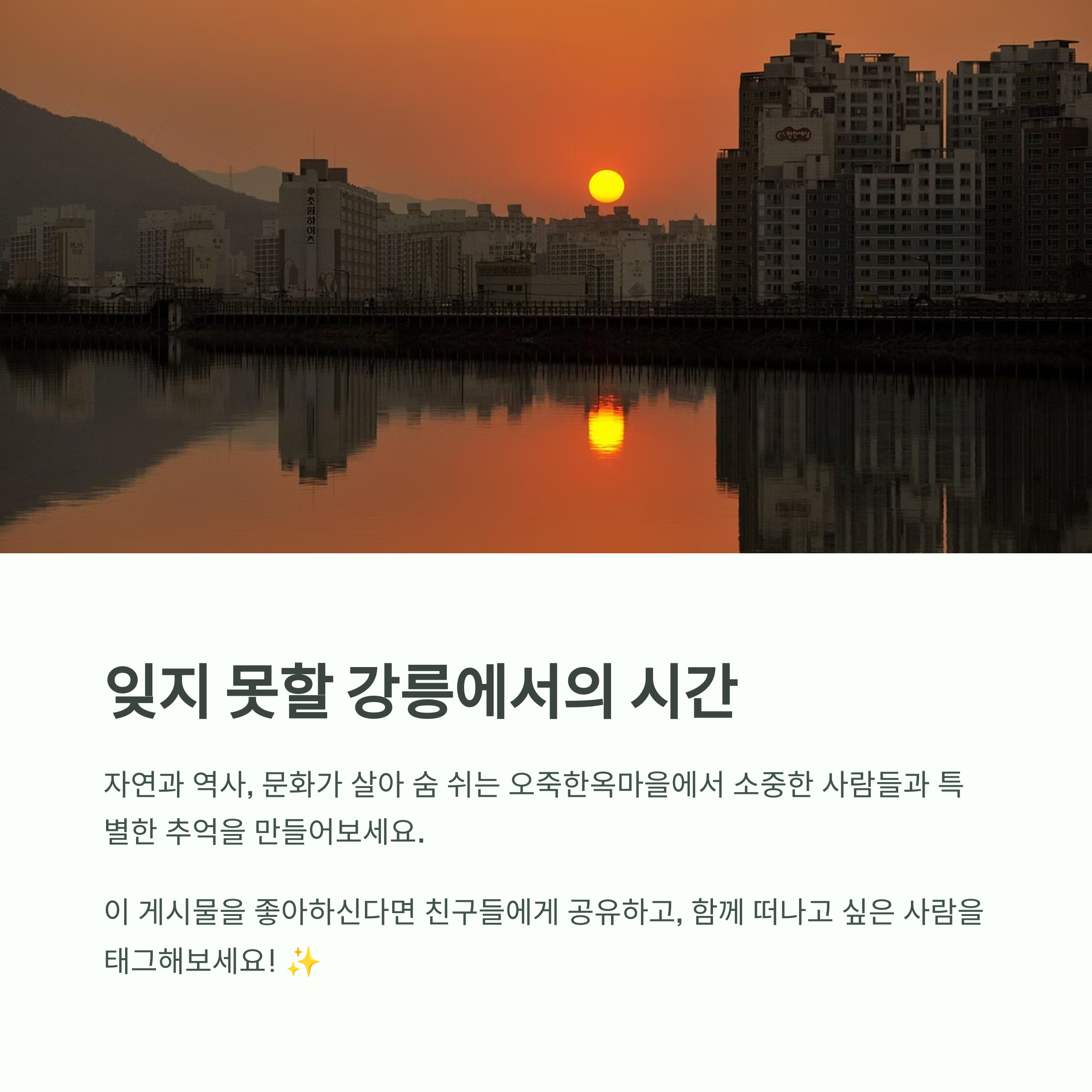 오죽한옥마을에서의 숙박 경험, 기억에 남는 순간, 강릉에서의 나만의 1박 2일 코스를 댓글로 공유해주세요!