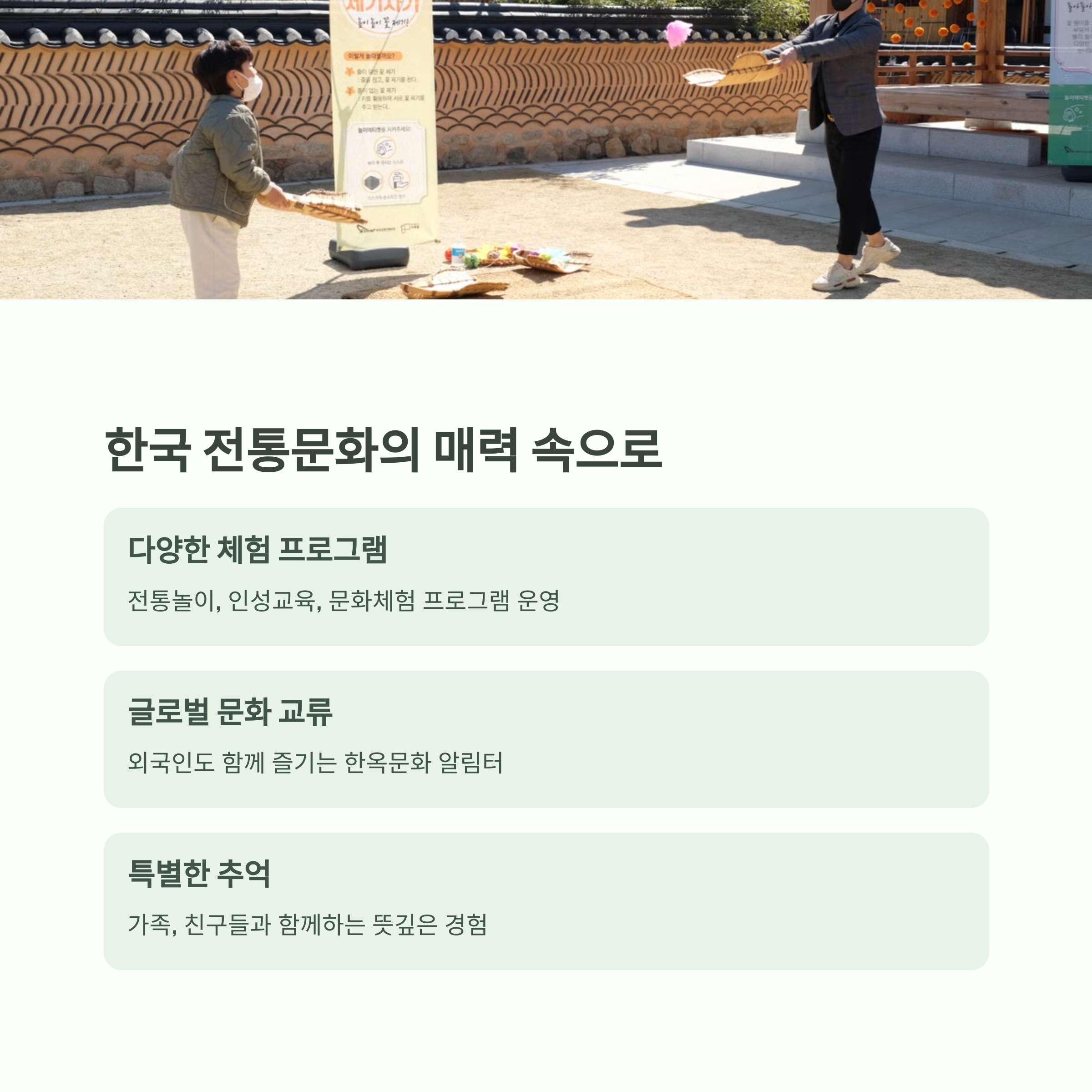 | 전통놀이, 세미나실, 공동취사동 등 부대시설 구비 | 가족, 연인, 단체까지 모두 가능한 다양한 객실 구성 | 전통과 현대가 어우러진 강릉 감성 스테이 완성 |