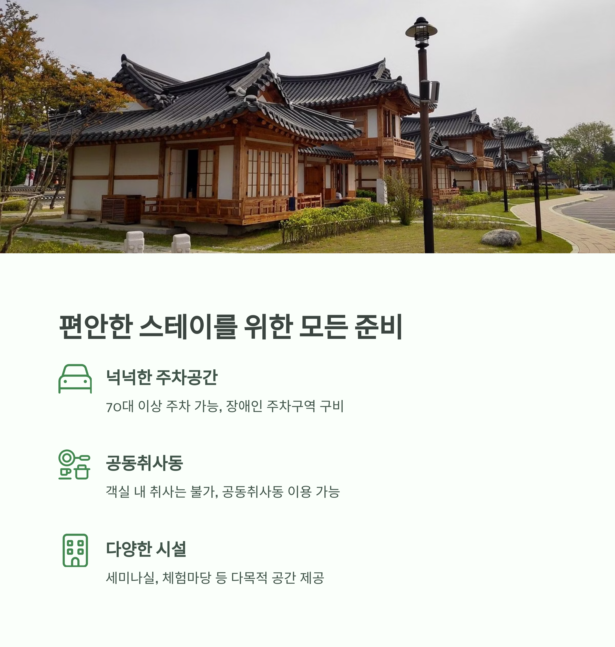 객실 내 취사는 금지되어 있으나, 공동취사동이 별도 마련되어 있어 간단한 조리나 공동 식사가 가능합니다. 마을 내에는 전통놀이 체험마당, 세미나실, 산책로, 한옥광장 등 다양한 부대시설이 있으며, 마을 전역이 한옥 구조물로 구성되어 있어 산책하는 것만으로도 특별한 여행 분위기를 느낄 수 있습니다.