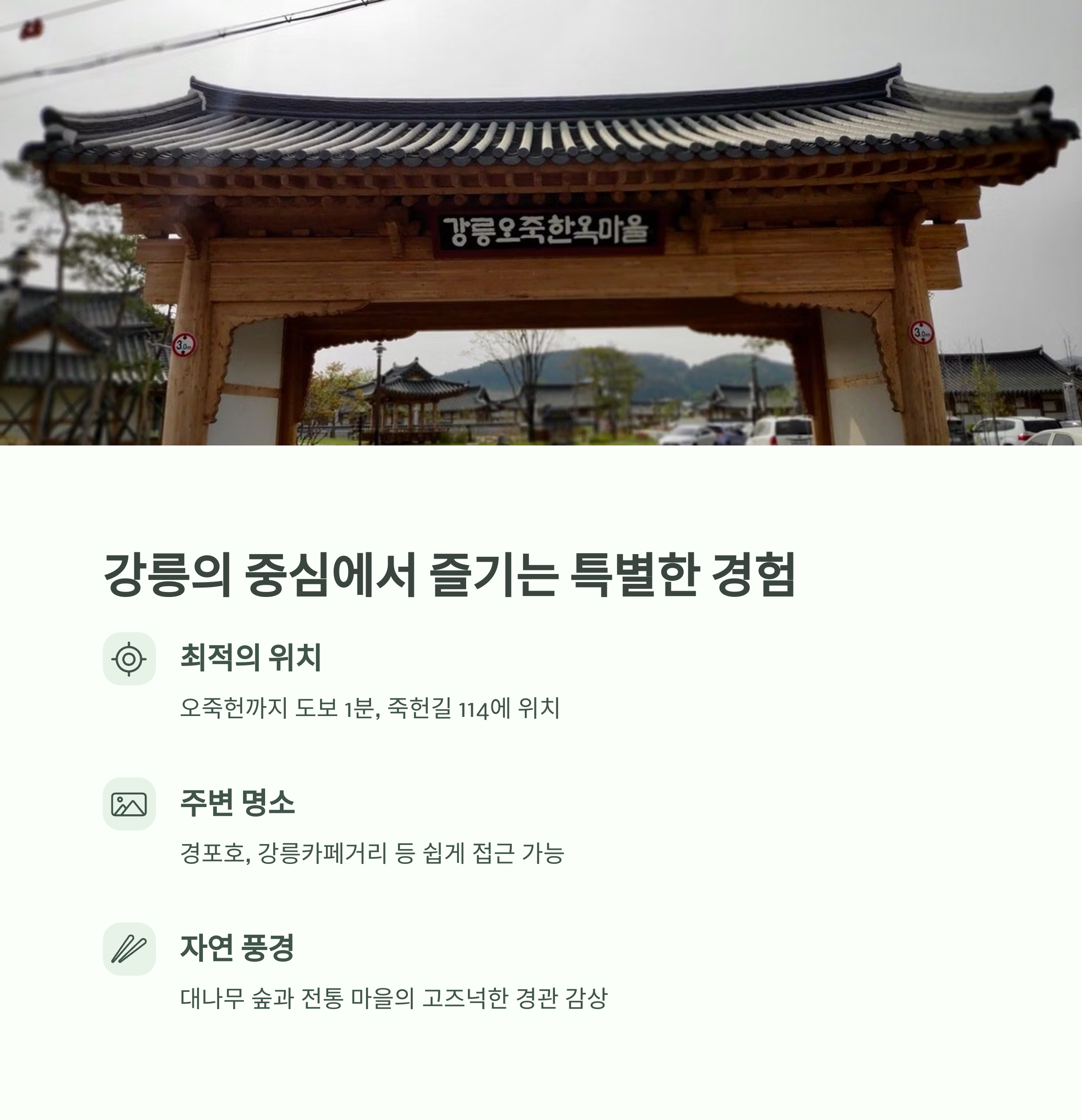 | 조용하고 아늑한 한옥 객실, 감성 인테리어 | 오죽헌 옆 위치, 산책하기 좋은 마을 구조 | 숙박+경포호+카페거리 연계로 완성되는 강릉 여행 |