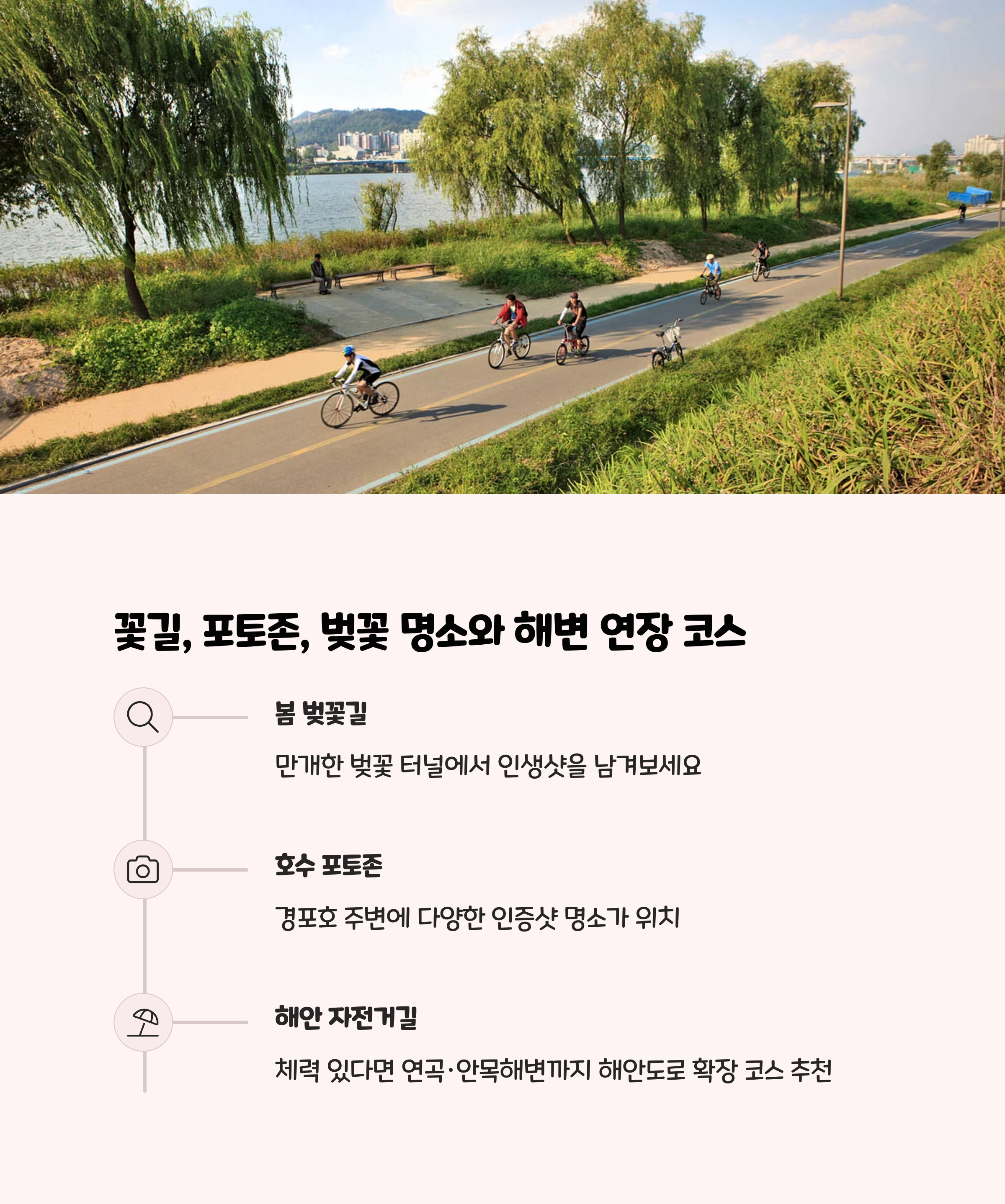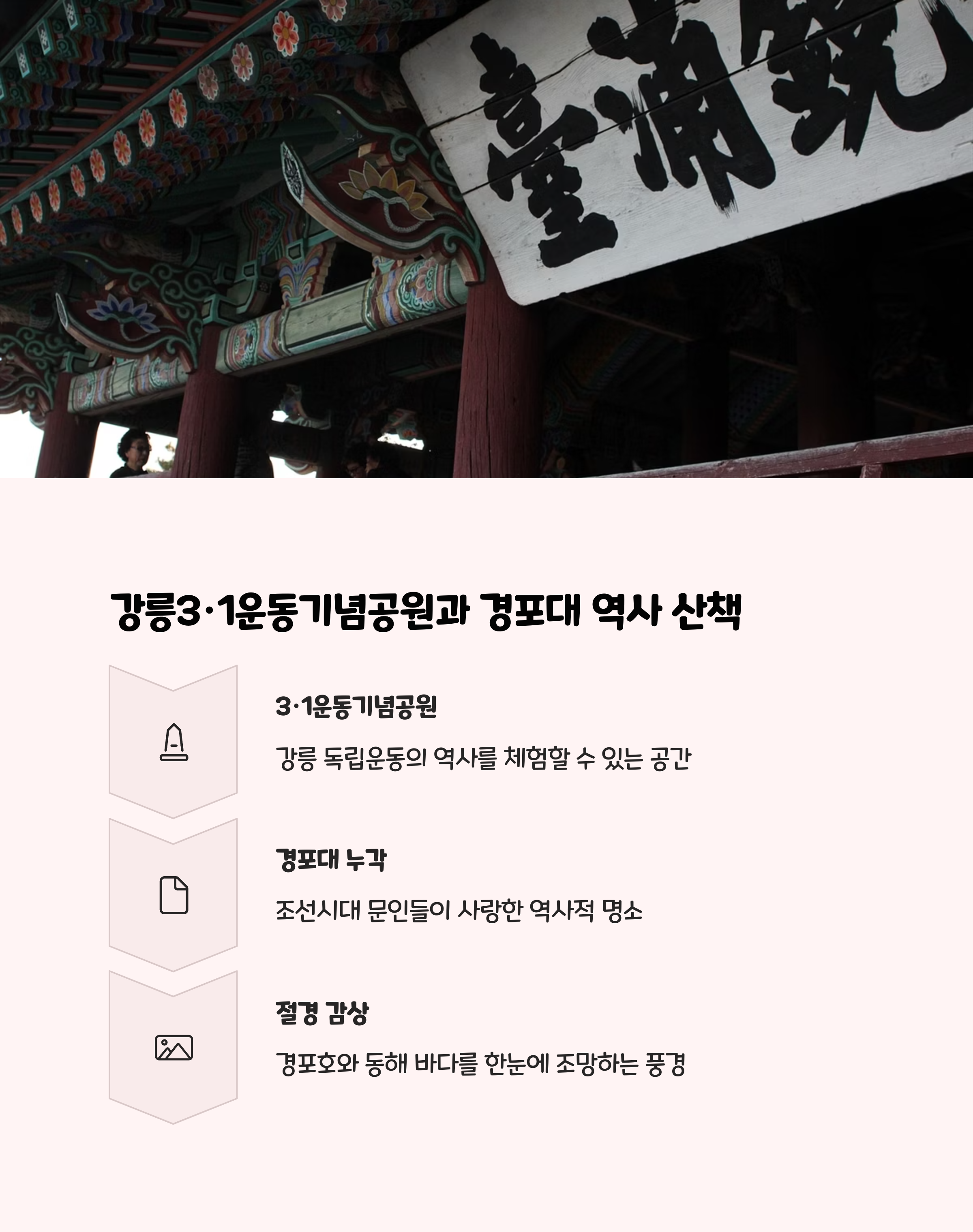 | 약 4.3km (경포호수 둘레 기준) | 경포대, 에디슨과학박물관, 안목해변, 연곡해변 | 봄(벚꽃), 가을(단풍), 여름(해안라이딩) |