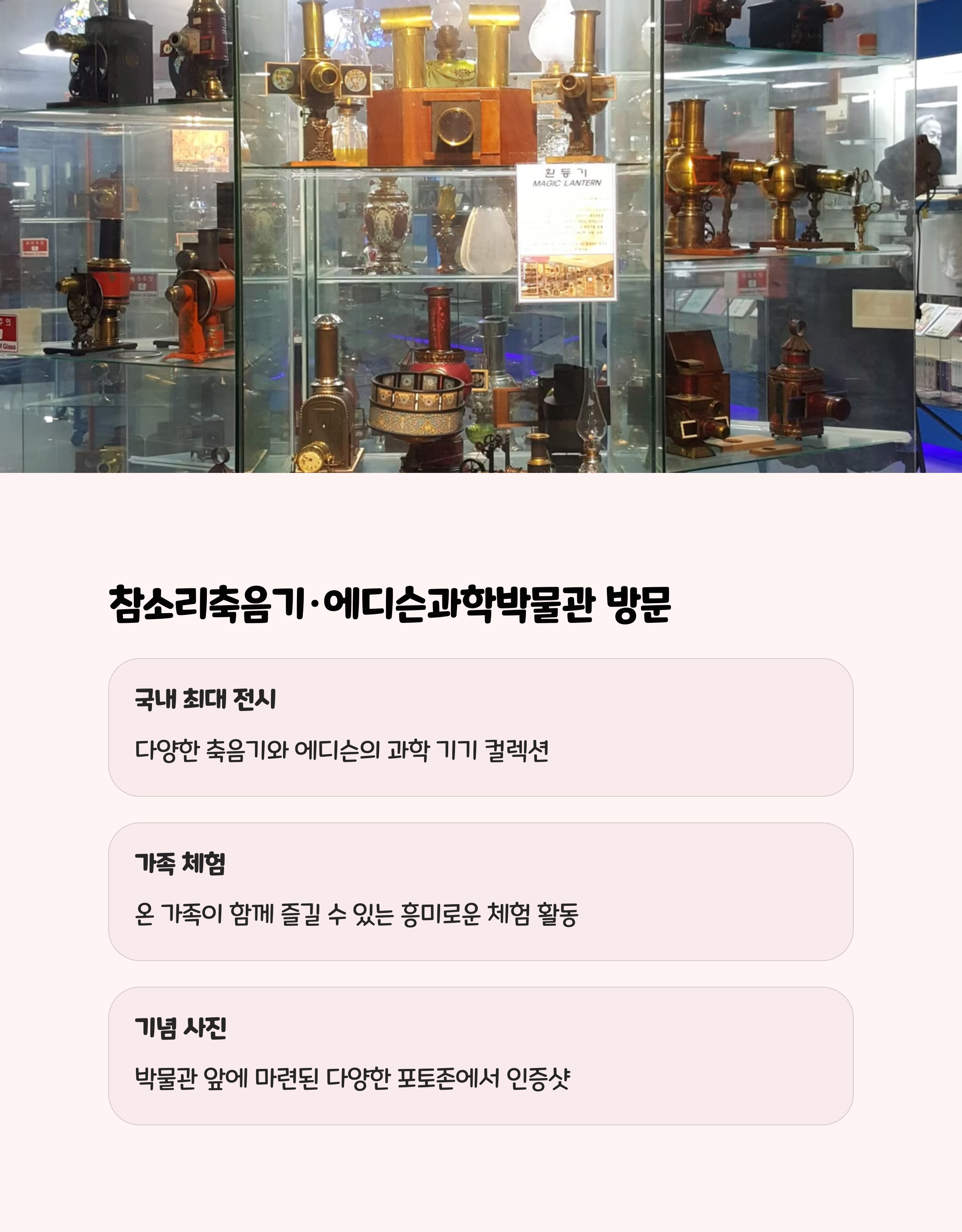 | 힐링 포인트 | 소나무 숲, 벚꽃길, 호수 전망, 다양한 포토존과 박물관 |
