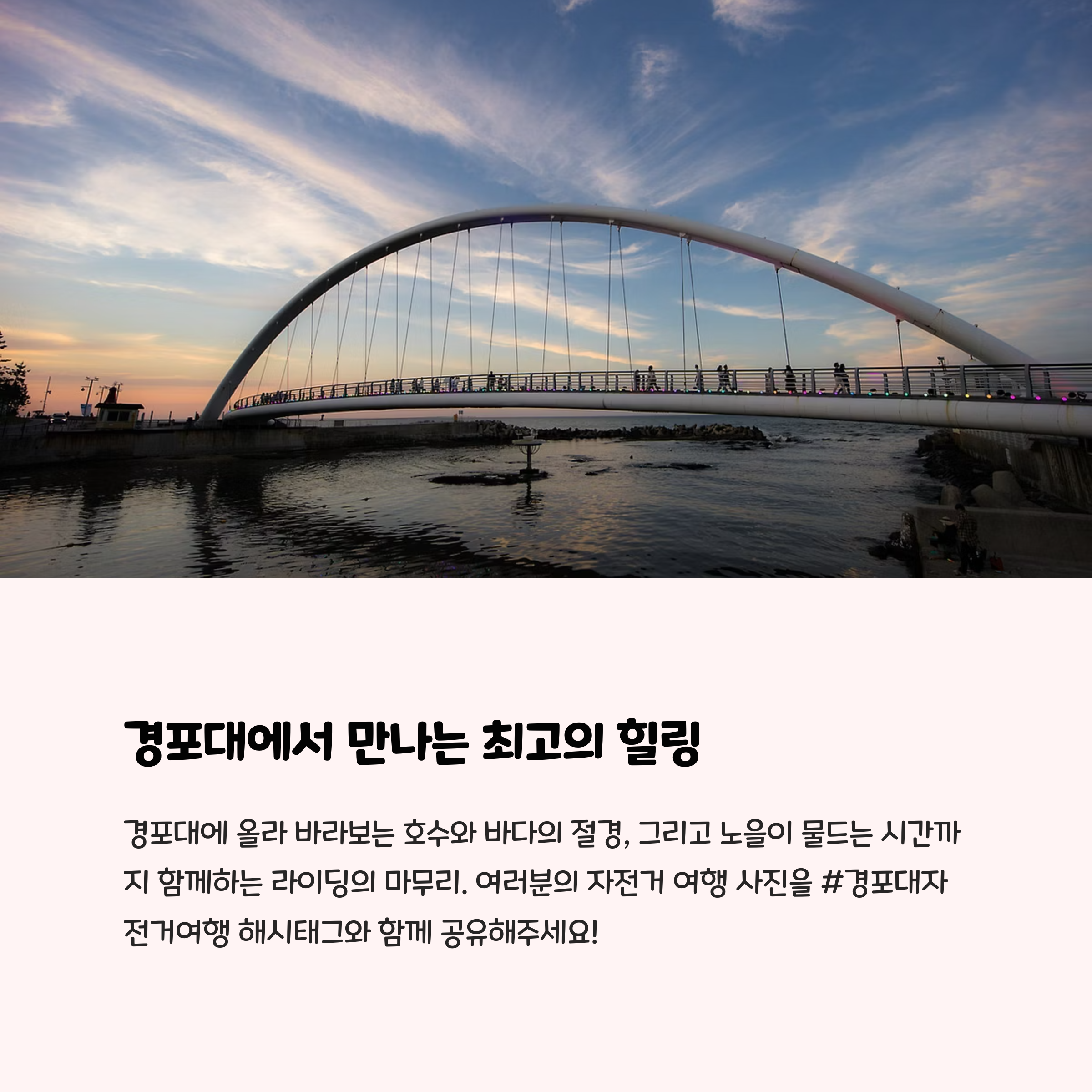 강릉 경포대 자전거 여행은 자연과 문화를 동시에 누릴 수 있는 특별한 시간입니다. 호숫가를 따라 걷듯이 달리고, 문화 명소를 천천히 들르며 사색과 여유를 즐길 수 있죠. 계절이 바뀔 때마다 다른 풍경을 보여주는 이 길 위에서, 나만의 속도로 여행을 즐겨보세요. 여행의 피로는 바람에 실어 보내고, 마음의 여유를 되찾는 소중한 시간이 될 것입니다.