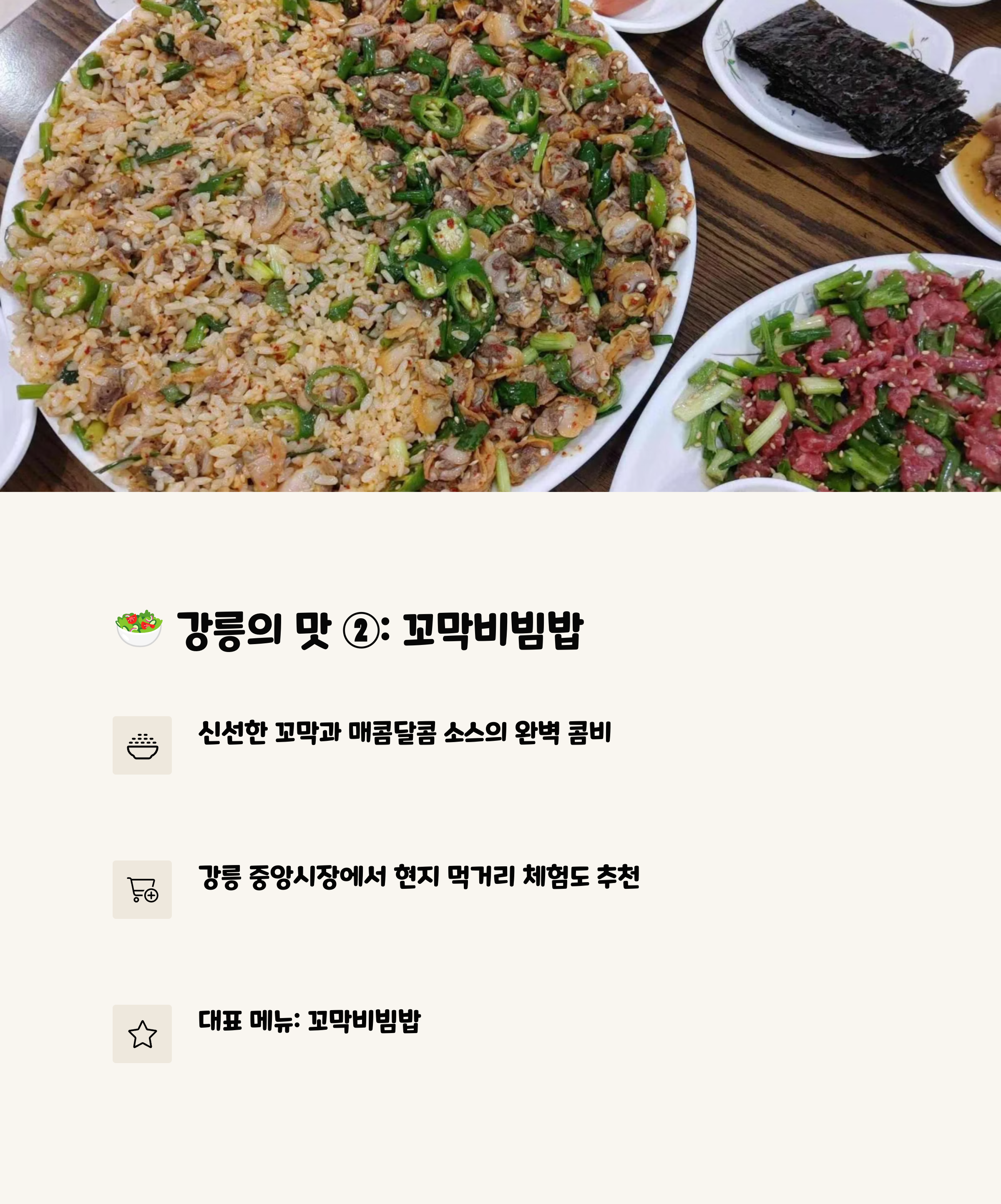점심은 엄지네 포장마차에서 강릉의 대표 먹거리 꼬막비빔밥과 꼬막무침을 추천합니다. 매콤달콤한 꼬막 양념과 밥, 김가루, 참기름이 어우러져 입맛 확 살리는 맛이에요. 식사 후에는 강릉 중앙시장을 들러 지역 특산물과 간식들을 쇼핑해 보세요. 감자빵, 옛날도너츠 등 먹거리도 다양합니다.
