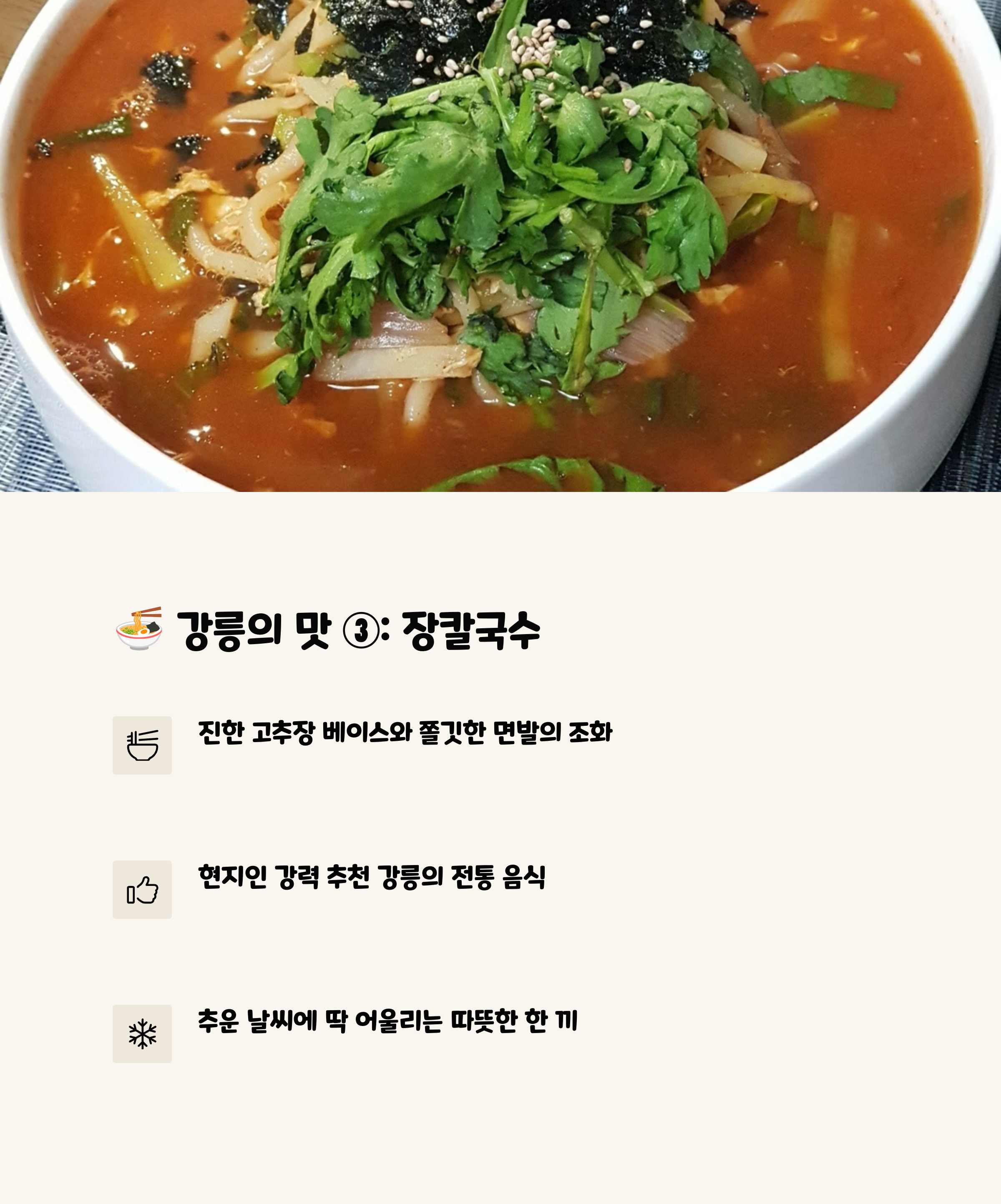| 추천 동선 | 경포해변 → 오죽헌 → 엄지네포장마차 → 하슬라 아트월드 → 형제칼국수 |