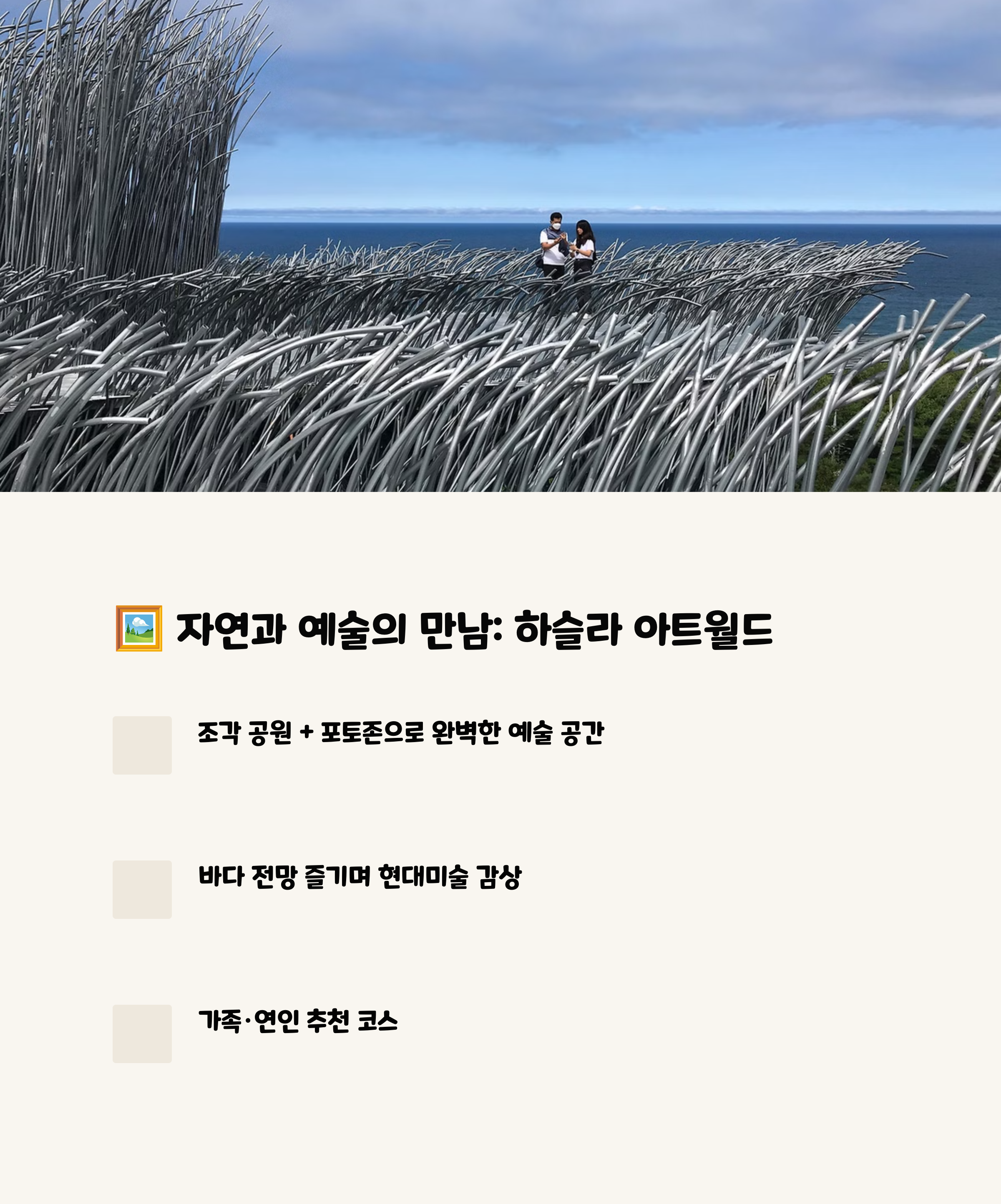 하슬라 아트 월드는 자연과 조형 예술이 어우러진 독창적인 미술 공간으로, 사진 찍기 좋은 포토존도 많습니다. 실내외 전시를 천천히 둘러보며 문화 감성도 함께 충전하세요. 저녁은 형제칼국수에서 마무리! 강릉의 대표 음식인 장칼국수는 얼큰하고 진한 국물 맛으로 하루의 피로를 개운하게 풀어줍니다.