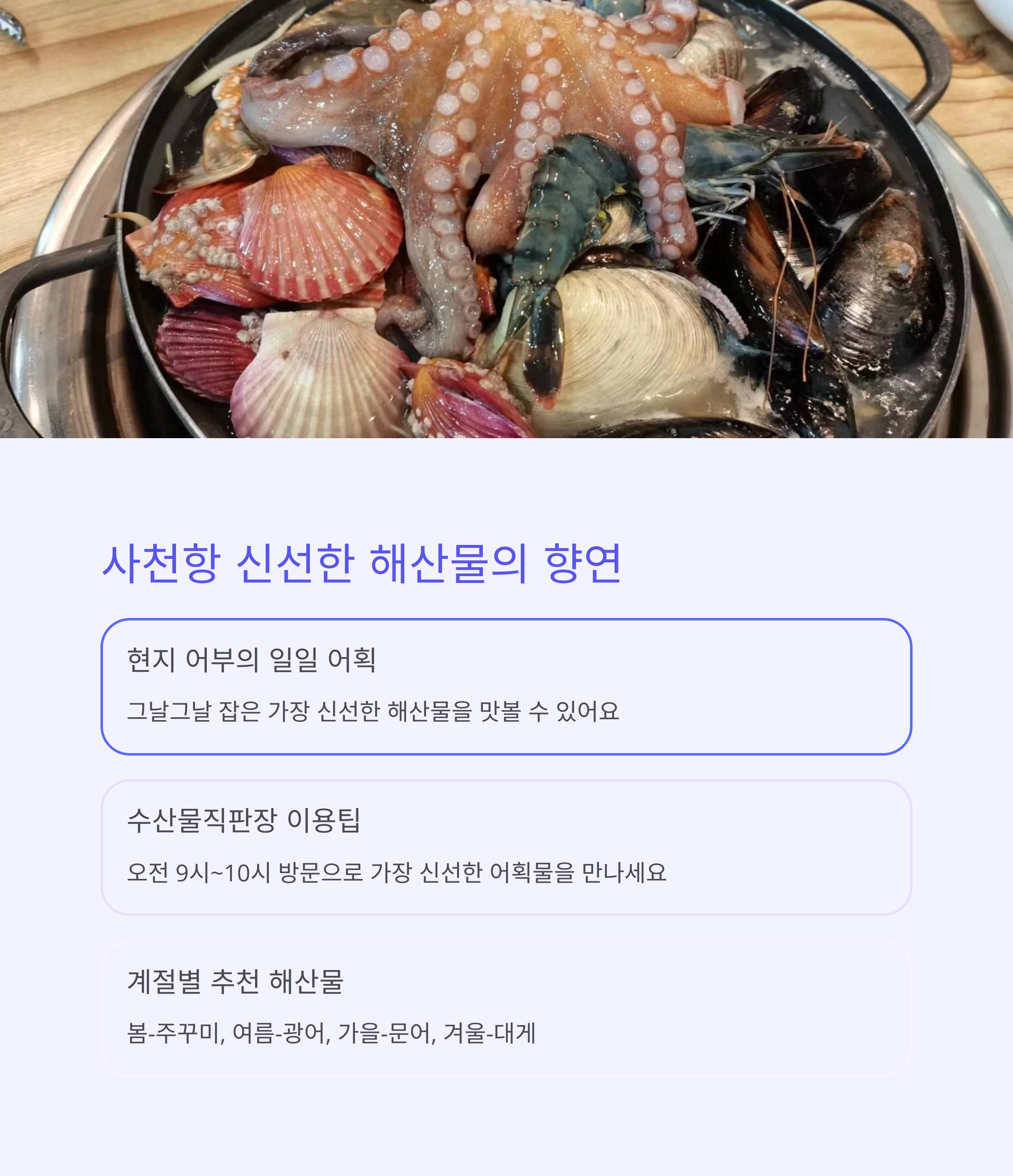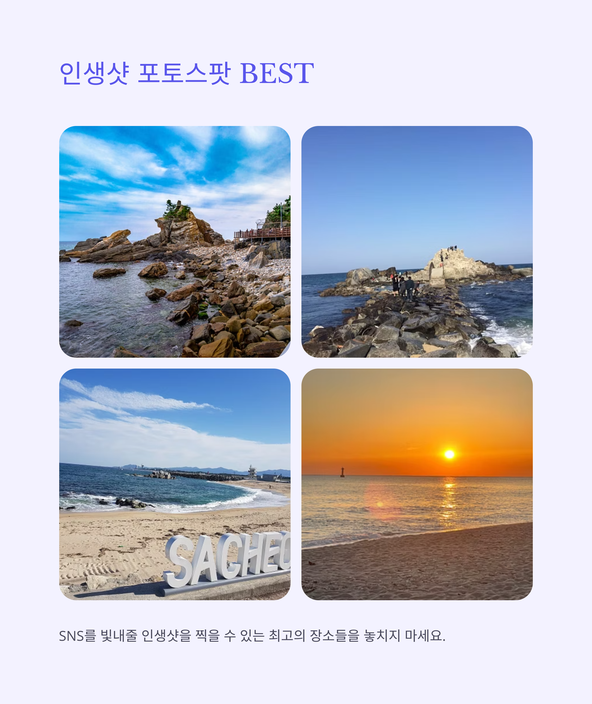 | 해송숲과 어우러진 산책로 | 베이커리카페 ‘곳’, 천국의 계단, 바위섬 | 사천항, 숙소 밀집, 조용한 분위기 |