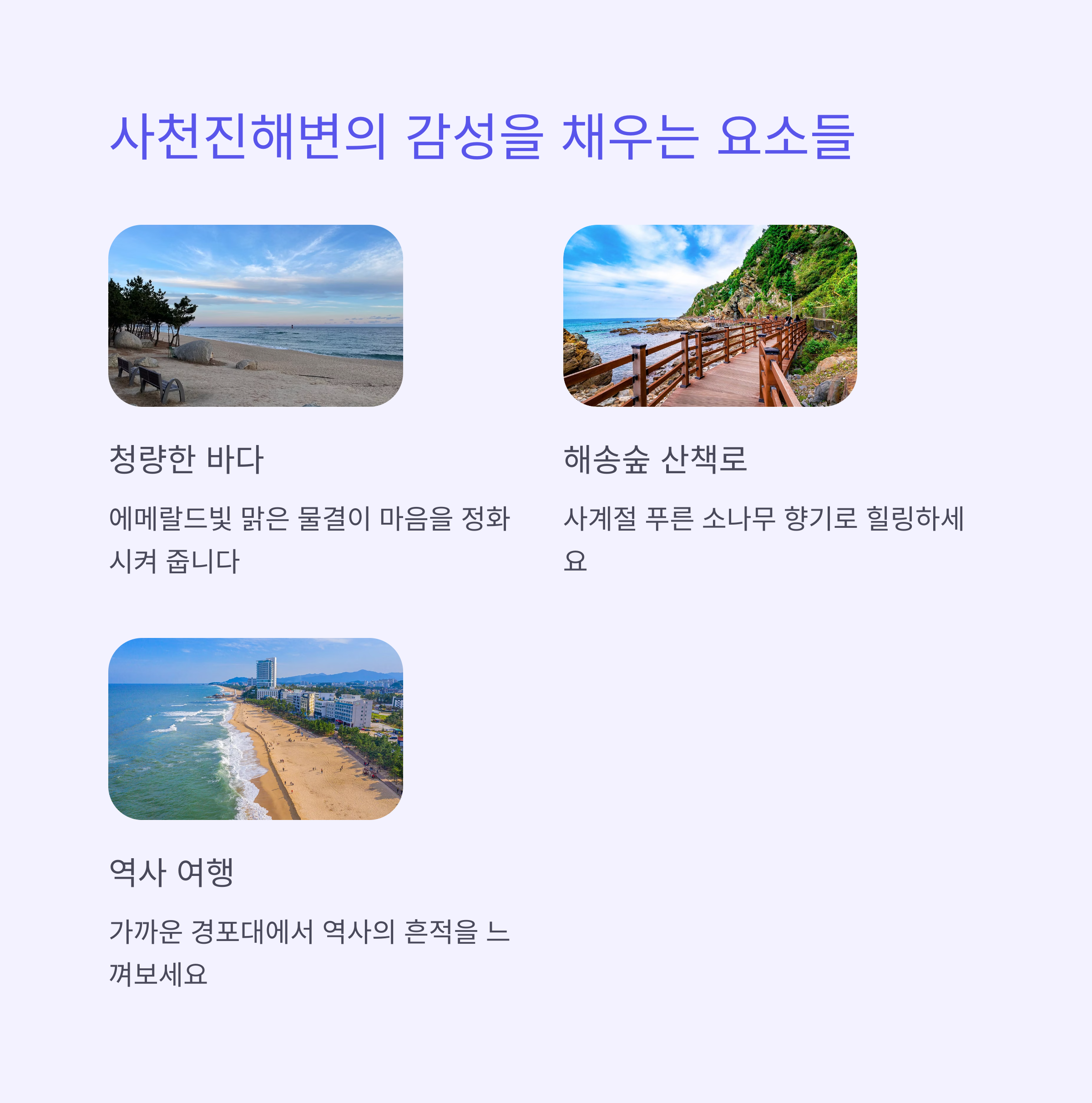 강릉 사천진해변은 도시의 번잡함에서 벗어나고 싶은 이들에게 최적의 장소입니다. 넓고 고운 백사장과 함께 펼쳐지는 바다는 보는 것만으로도 마음을 정화시켜줍니다. 해안선을 따라 조성된 산책로는 바다와 해송숲이 조화롭게 어우러져 감성적인 분위기를 자아냅니다. 아침 햇살이 비추는 시간에 걷는 것도 좋지만, 석양이 질 무렵 붉게 물든 하늘을 바라보며 걷는 길은 마치 영화의 한 장면 속을 걷는 듯한 느낌을 줍니다. 조용히 걷다 보면 자연스레 마음이 차분해지고, 삶의 여유를 다시금 떠올리게 되는 소중한 시간이 됩니다.