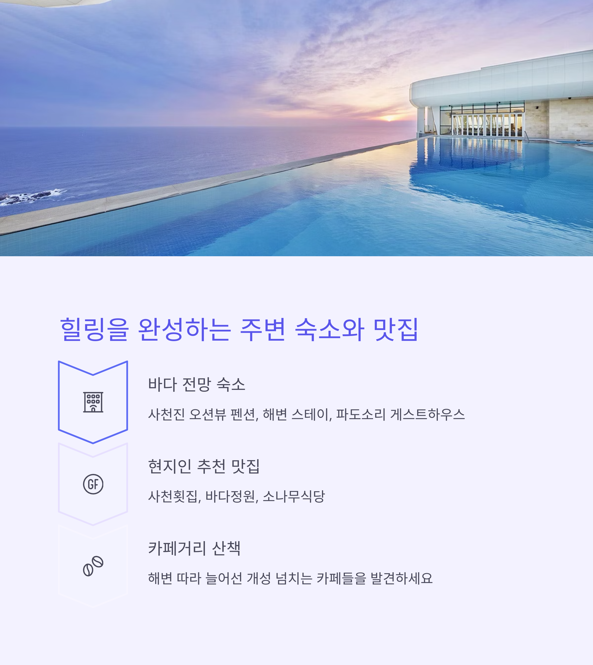 | 해송숲과 어우러진 산책로 | 베이커리카페 ‘곳’, 천국의 계단, 바위섬 | 사천항, 숙소 밀집, 조용한 분위기 |