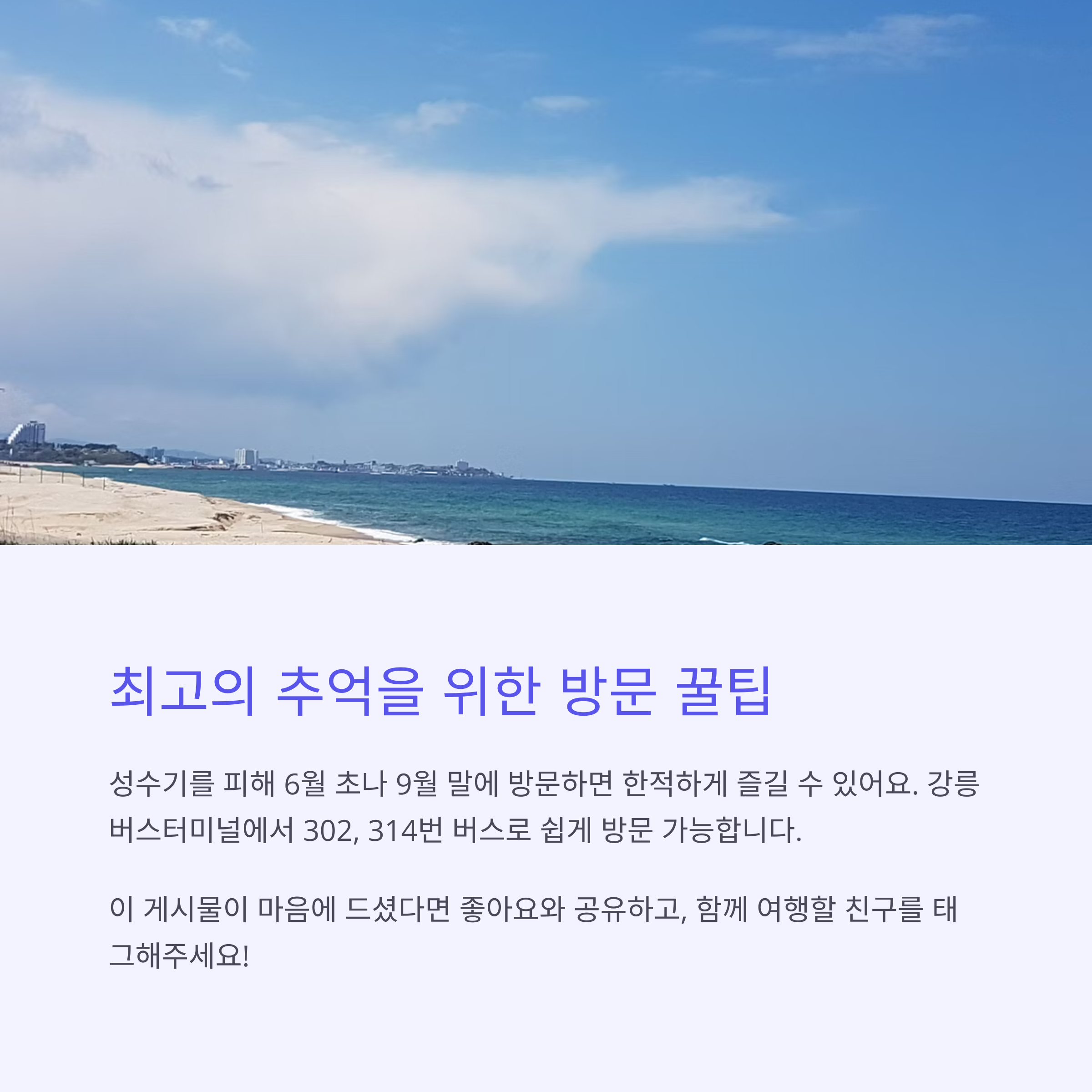 강릉 사천진해변을 다녀오신 분들의 소감이나, 이 글을 보고 새롭게 알게 된 정보가 있다면 댓글로 나눠주세요. 여러분의 여행 경험과 생각이 다른 분들께도 큰 도움이 될 수 있습니다.