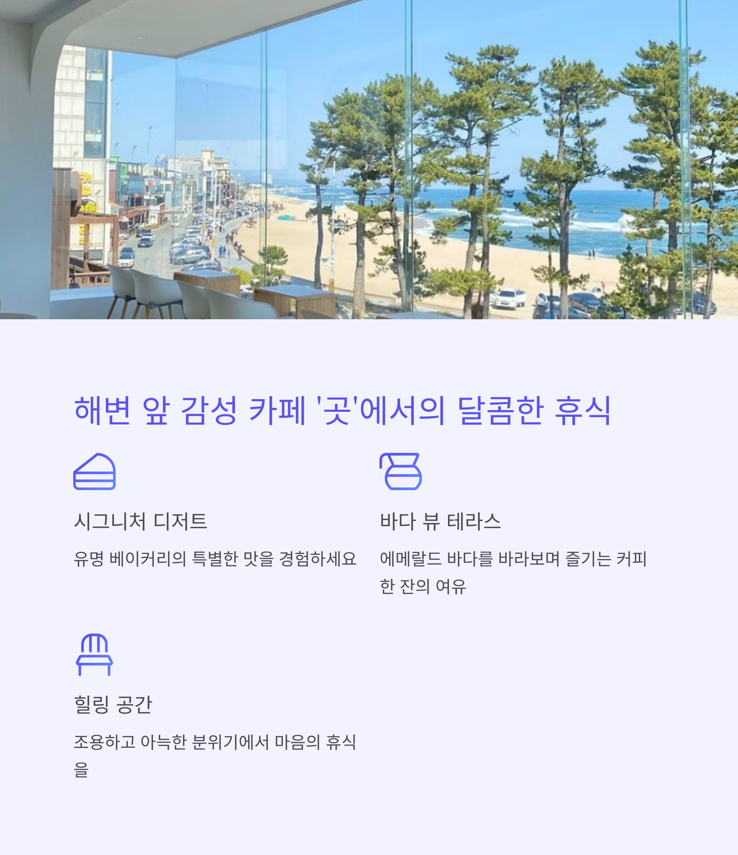 사천진해변의 특별한 매력은 감성적인 포토스팟에도 있습니다. 해변 바로 앞에 자리한 베이커리 카페 ‘곳’은 통창을 통해 바다를 조망할 수 있어 인생샷을 남기기에 완벽한 공간입니다. 천국의 계단으로 불리는 전망 계단은 발 아래로 펼쳐지는 해변 풍경이 아름다워 많은 사람들이 찾는 명소입니다. 바다를 배경으로 사진을 찍으면 누구나 감성적인 분위기를 연출할 수 있으며, 바위섬 주변에서도 자연과 함께한 특별한 사진을 남길 수 있습니다. 이러한 요소들이 모여 단순한 해변 산책 이상의 특별한 경험을 선사합니다.