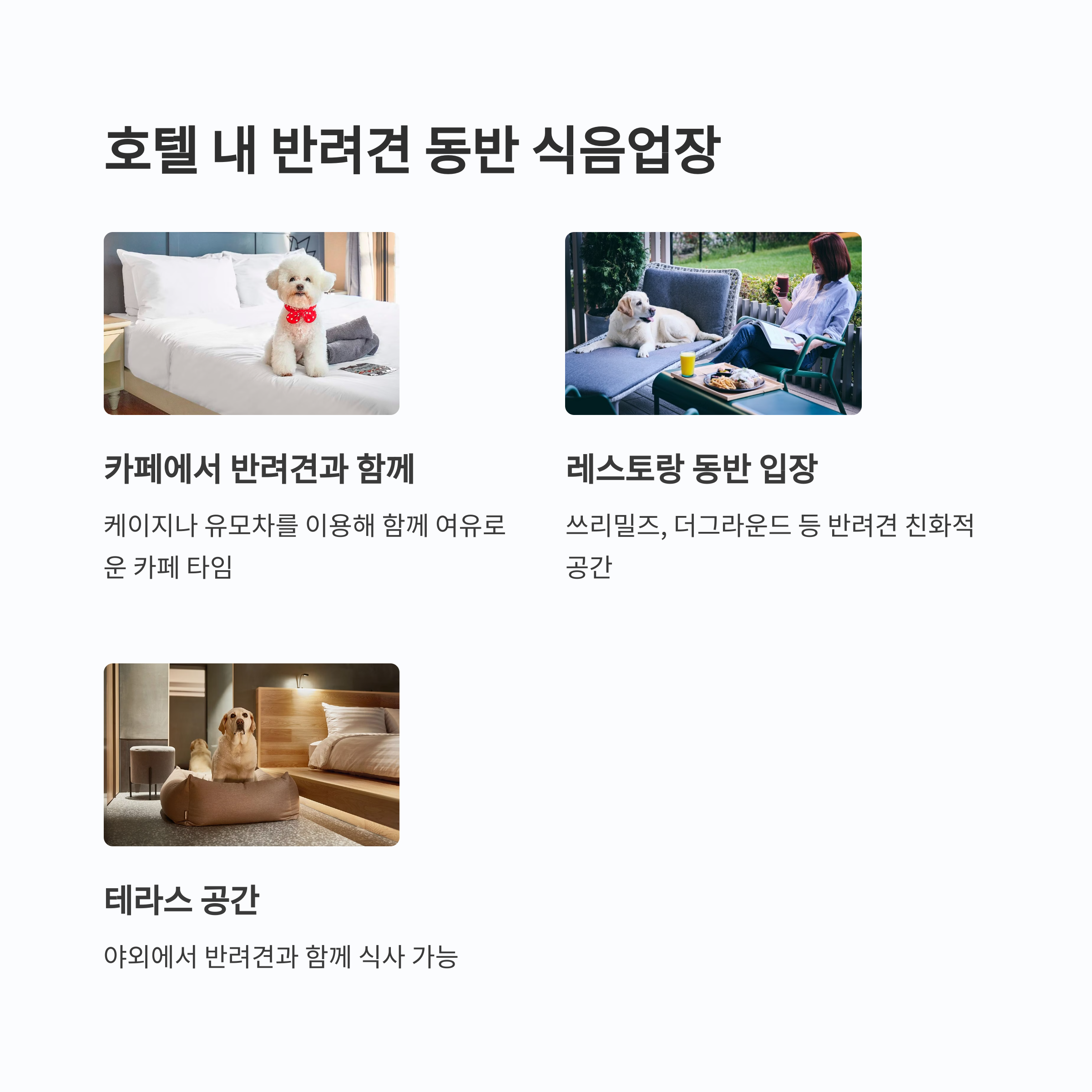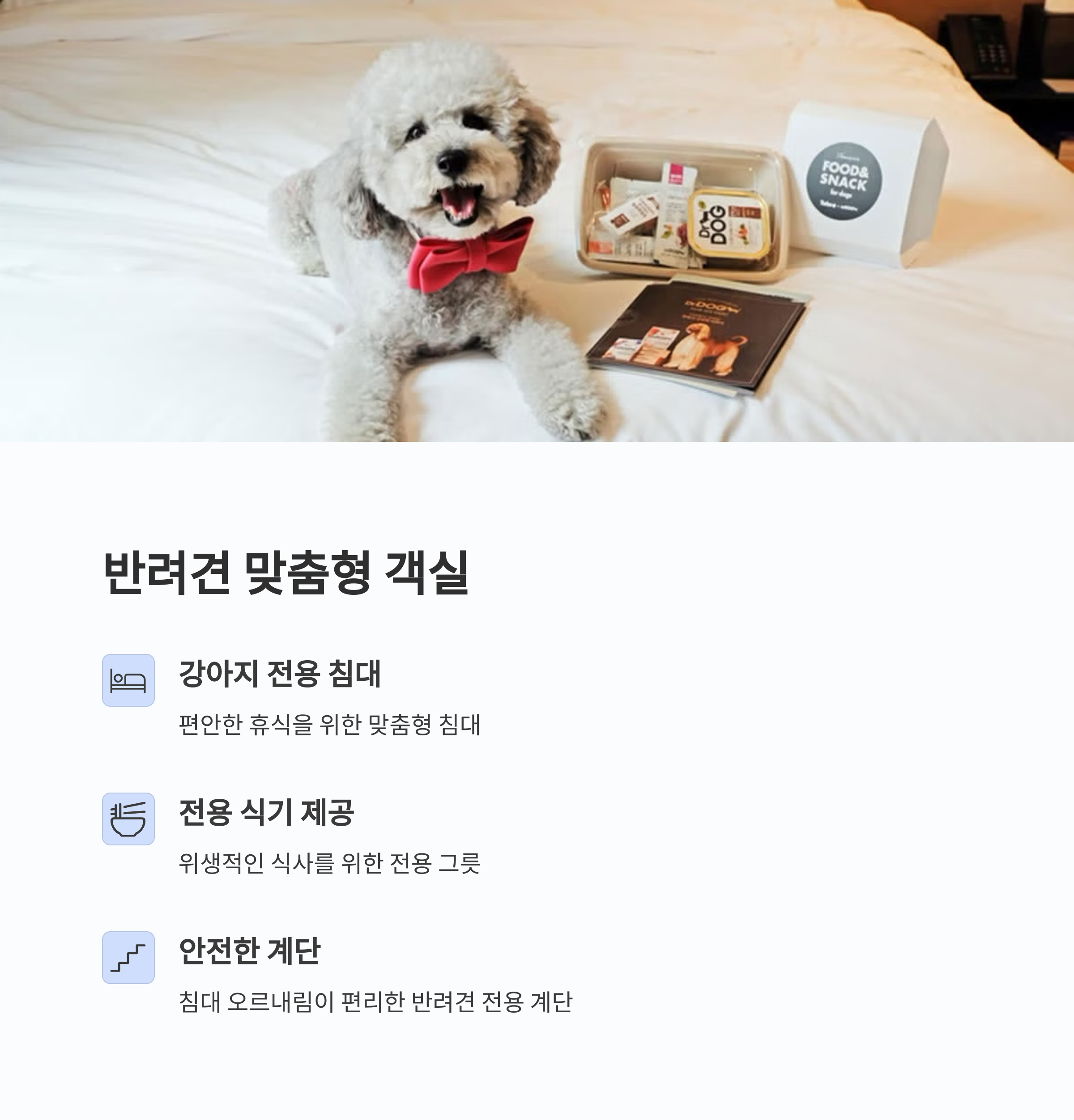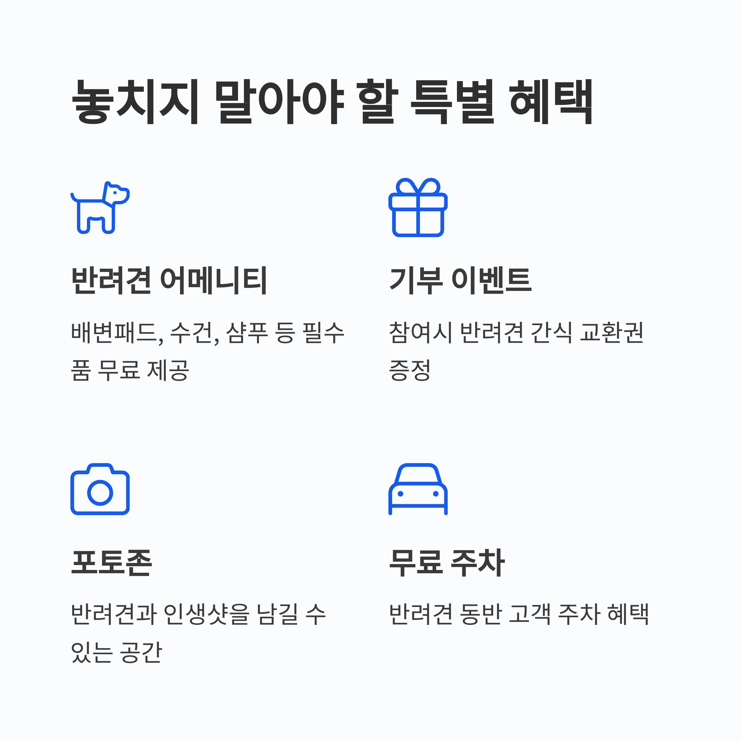 | 반려견 동반 조건 | 무게 제한 없이 가능 / 펫룸 전용 층 배정 / 추가 요금 발생 |