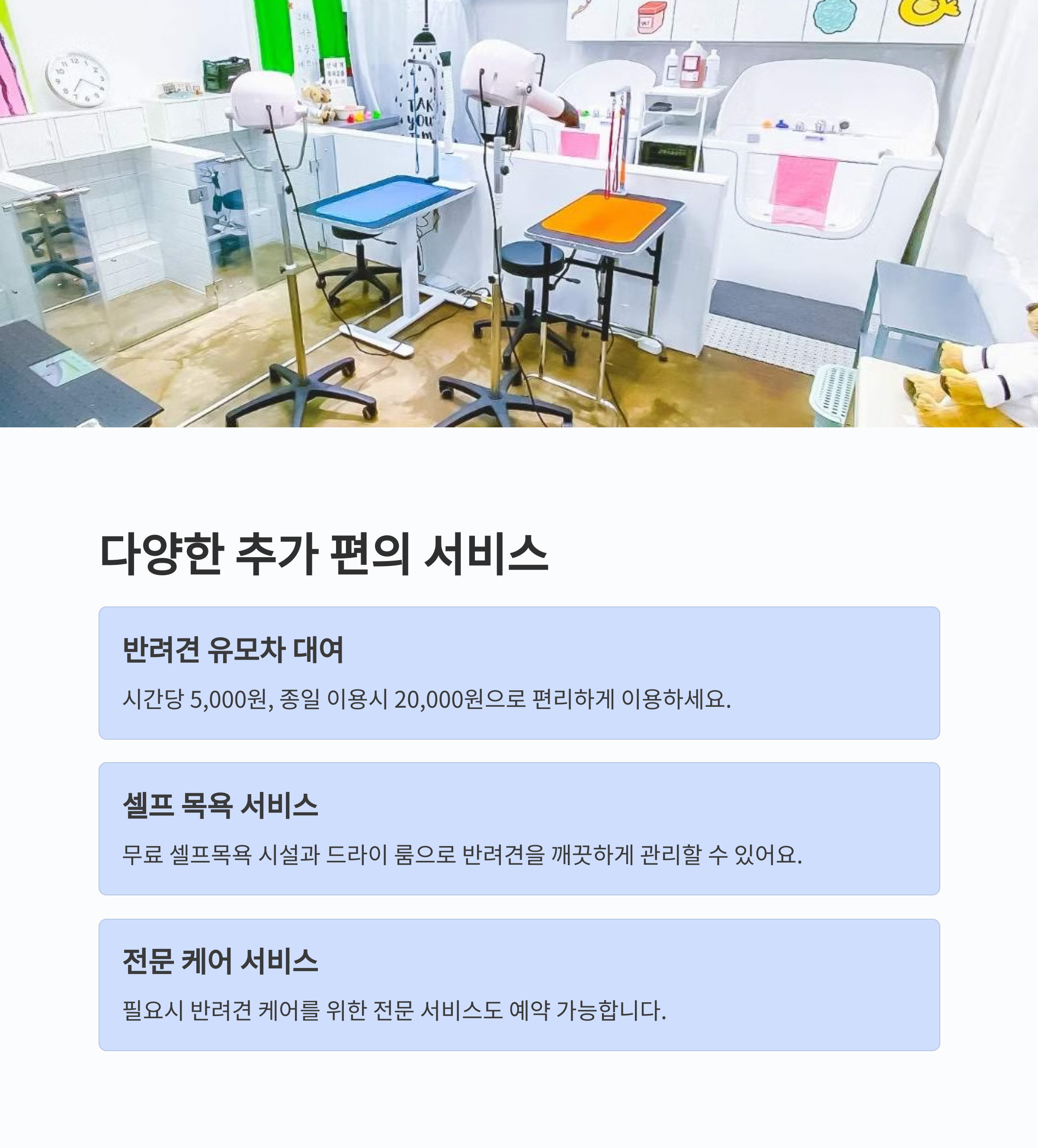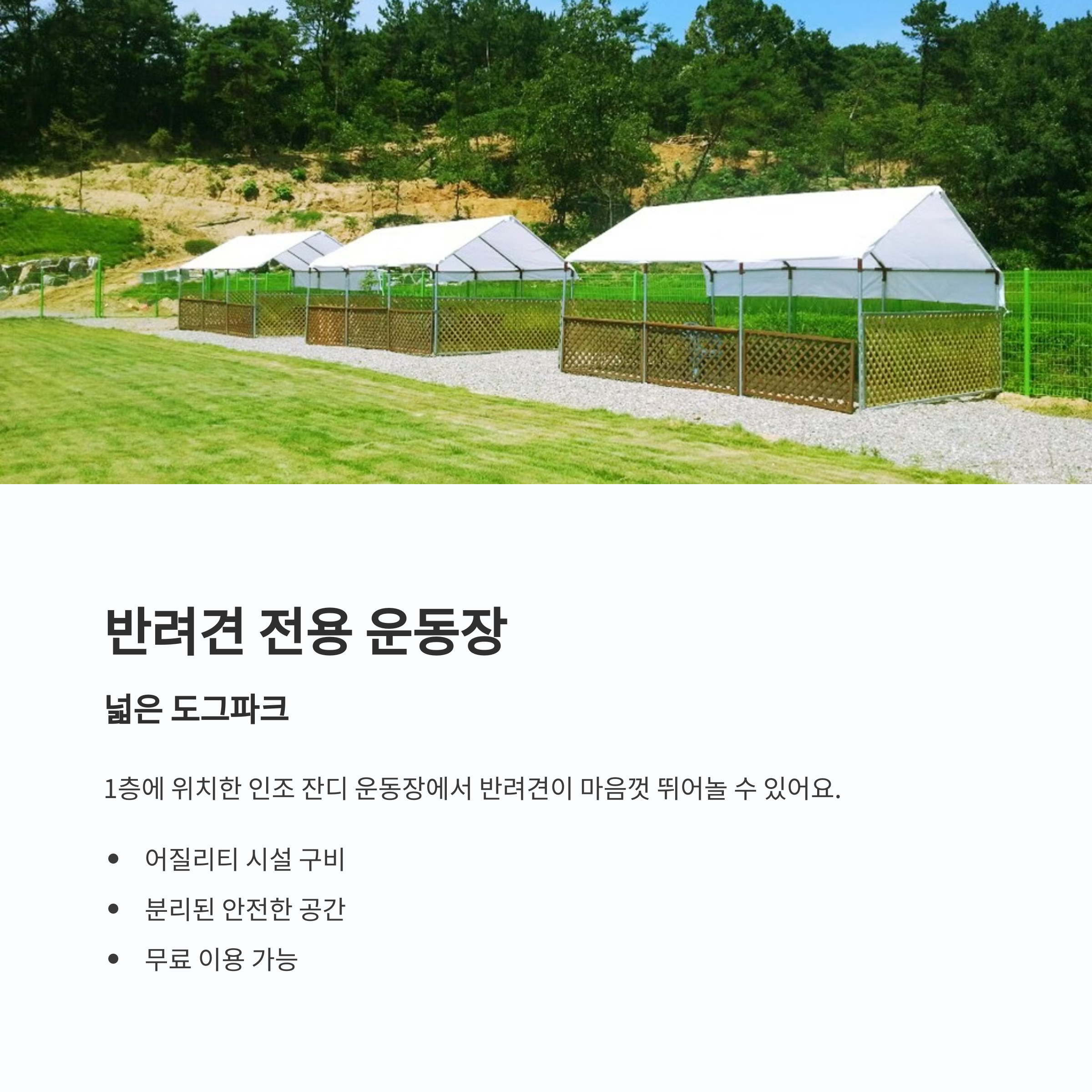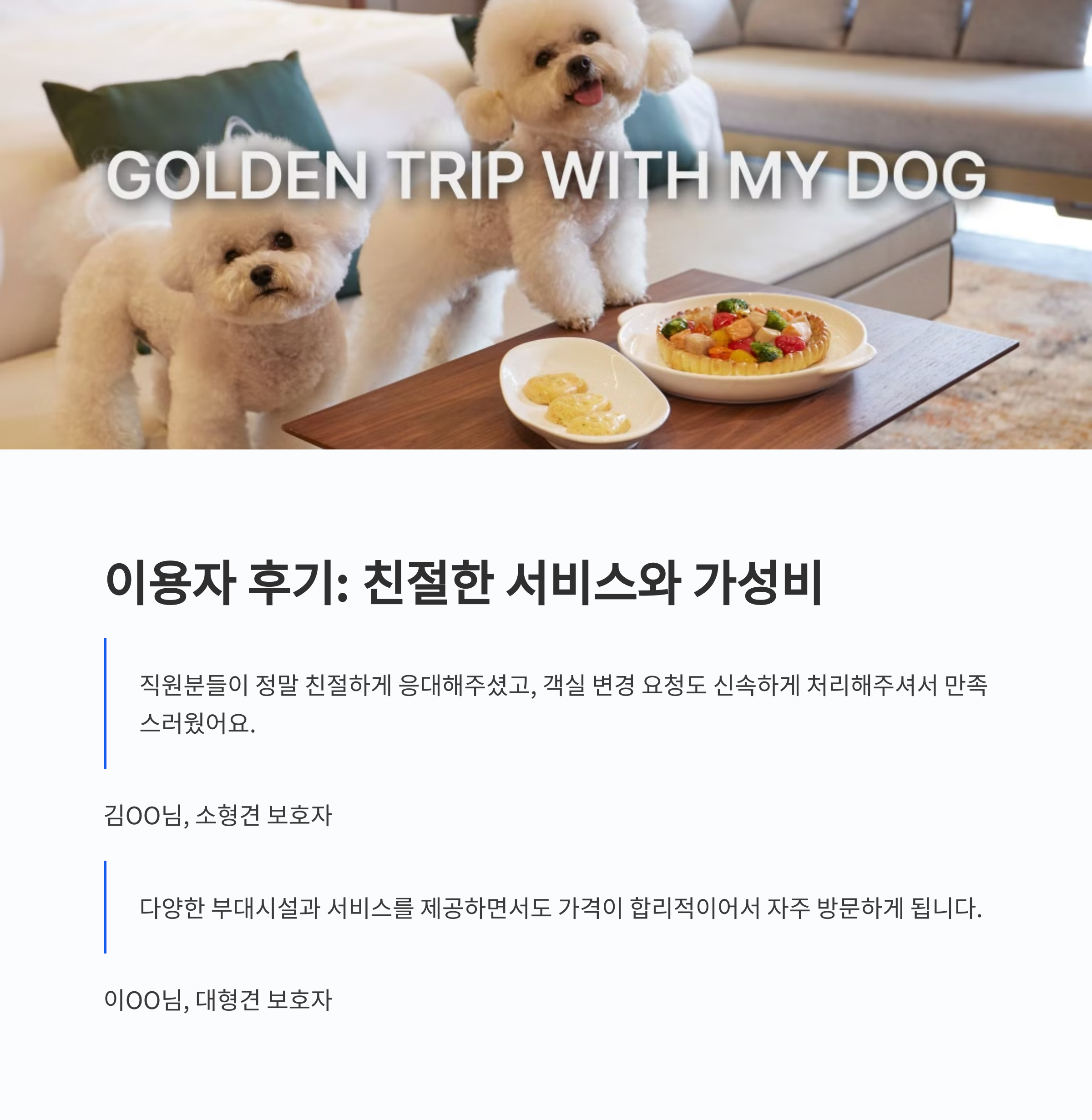 | 펫룸 전용 층, 반려견 전용 침대, 식기, 계단, 패드 등 완비 | 운동장, 개모차 대여, 식음업장 반려견 입장 가능 | 직원 응대 친절, 요청사항 반영 빠름, 전체적으로 높은 만족도 |