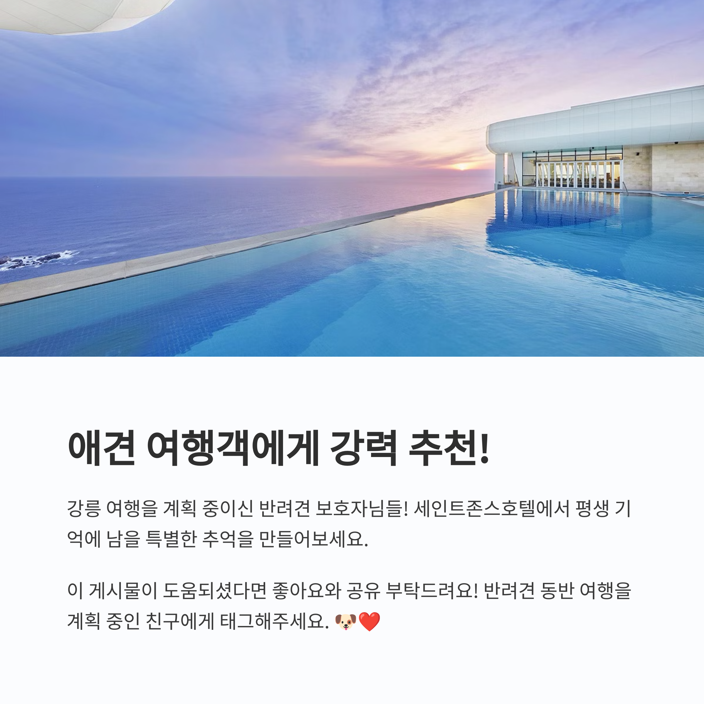강릉 세인트존스호텔은 반려견과의 편안한 여행을 위해 준비된 세심한 서비스와 인프라가 인상적이었습니다. 강아지도 사람도 만족하는 여행을 원하신다면, 강문해변 앞에서 여유와 배려가 살아 있는 이 호텔을 꼭 한 번 경험해보시길 추천드립니다.