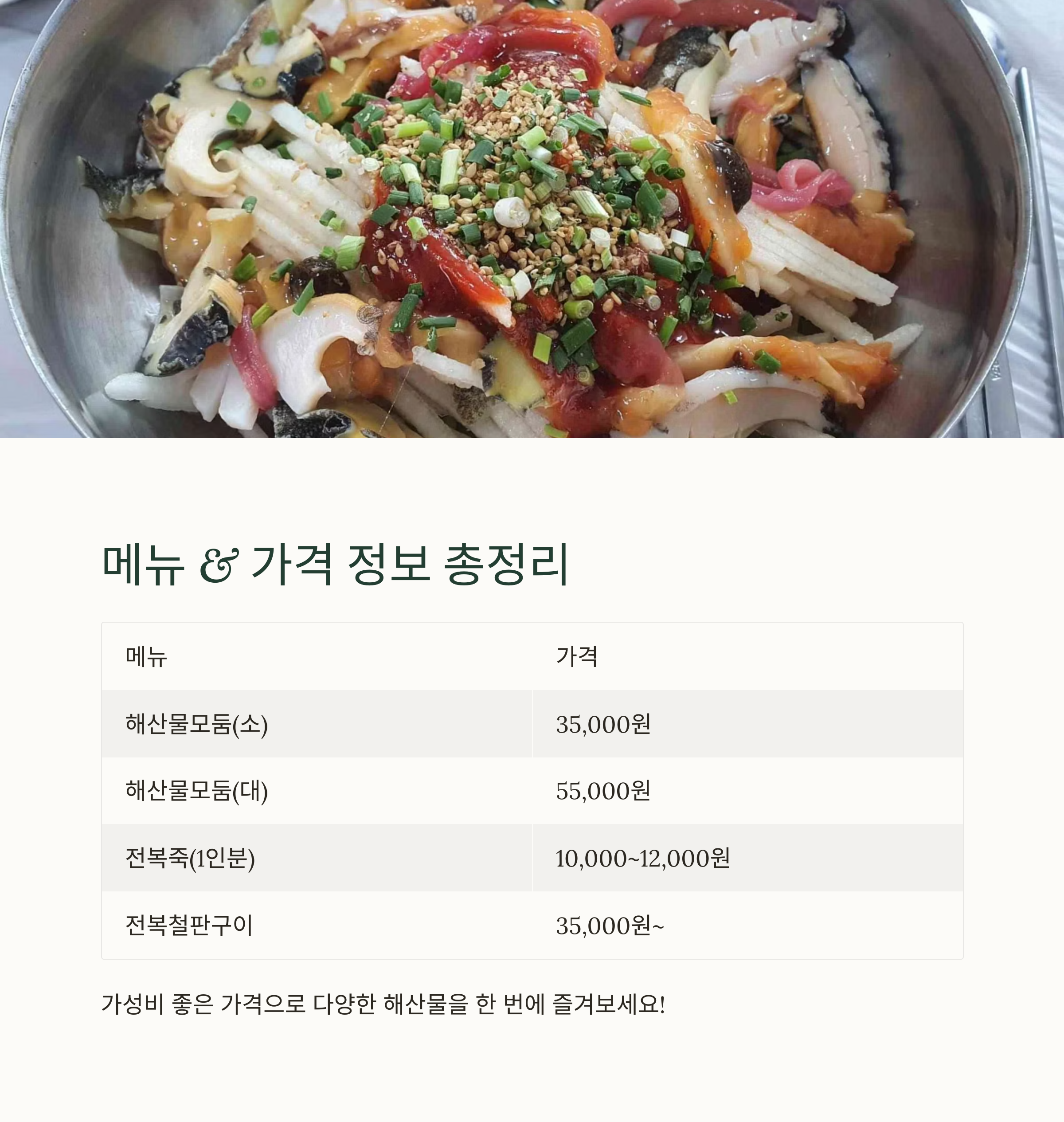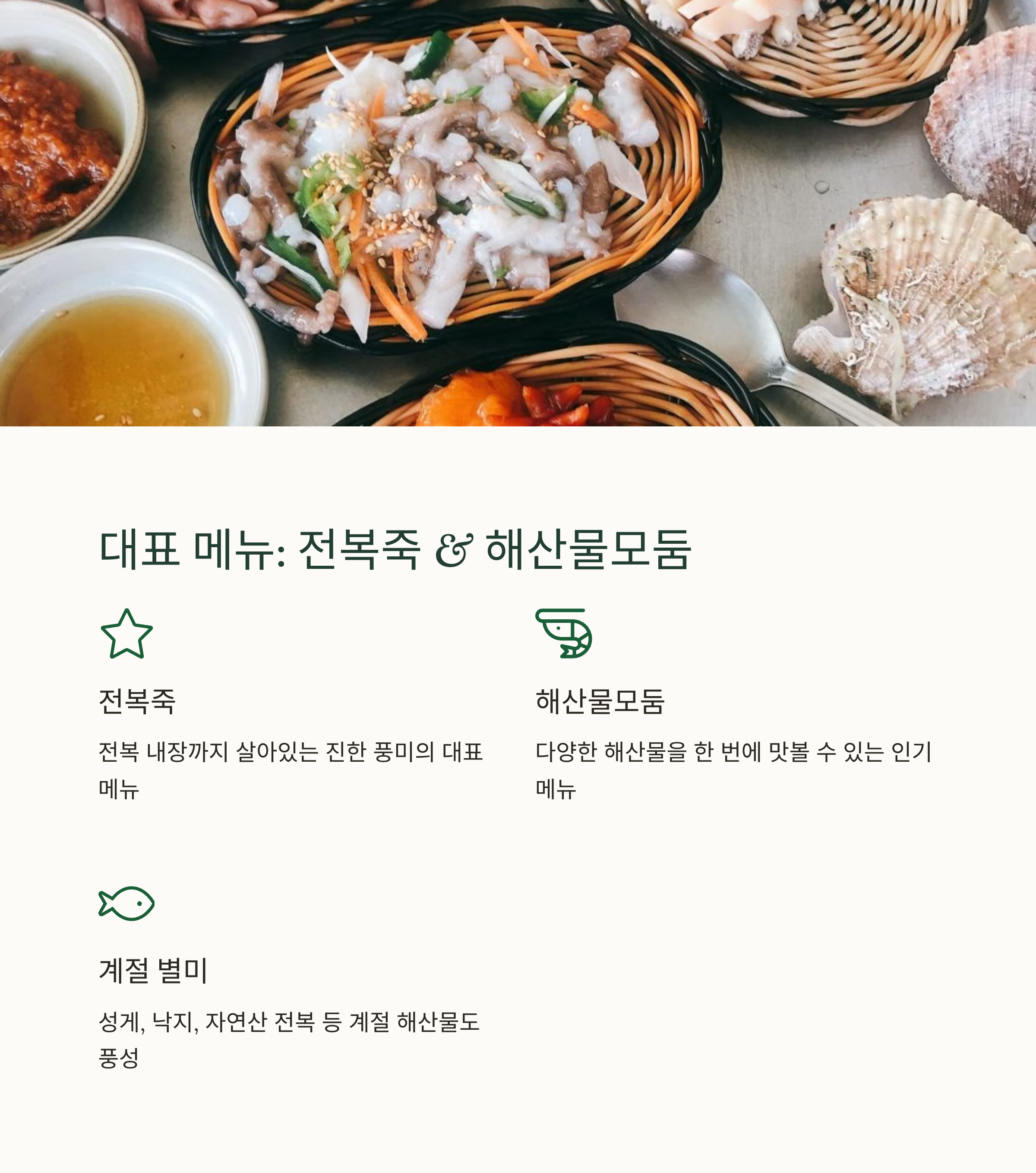 | 대표 메뉴 | 전복죽, 성게죽, 해산물모둠, 전복버터구이, 낙지볶음, 자연산 해산물 |