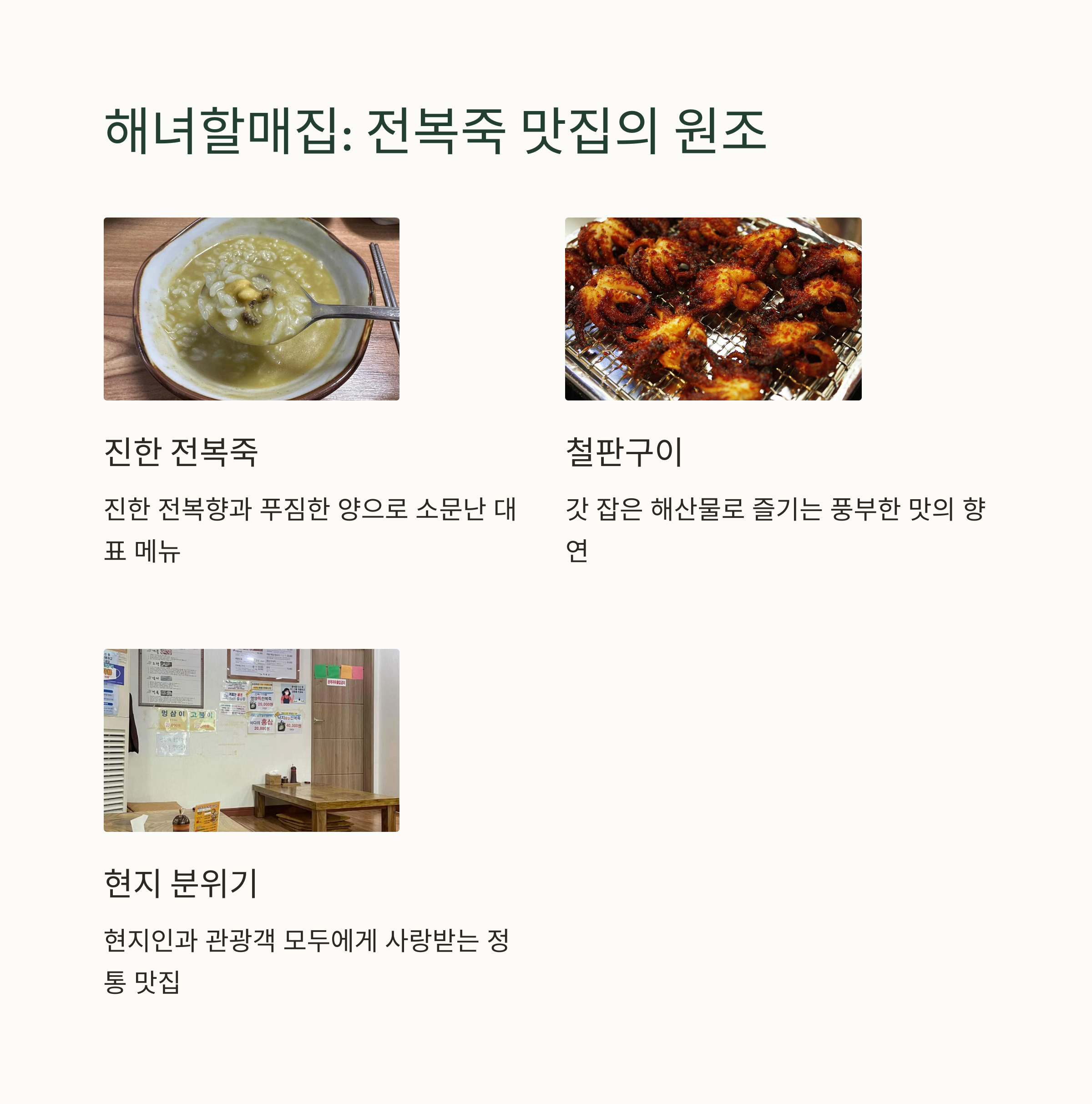 | 해녀할매집, 조씨할매집 | 전복죽, 전복버터구이, 성게죽 | 해산물모둠 소/대, 가격 합리적 |