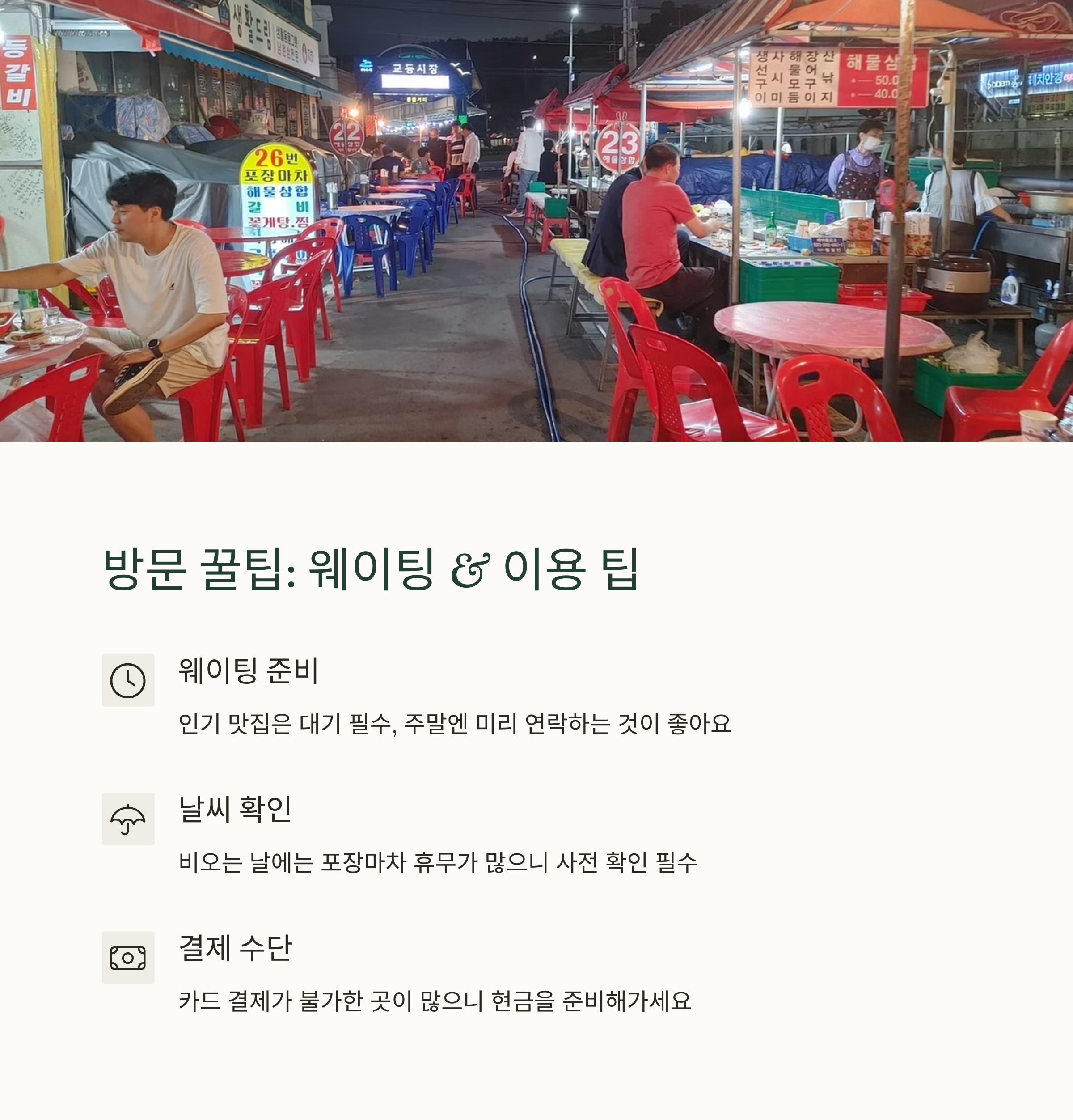 연화리 해녀촌은 주말, 공휴일엔 웨이팅이 길 수 있어 이른 점심시간(11시~12시 전) 방문을 추천드립니다. 포장마차 거리도 깔끔하게 정비되어 있어 편하게 바닷가를 바라보며 식사 가능하고, 대부분 현금 및 간편결제 가능하니 참고하세요. 전복죽 가격은 10,000~12,000원선으로 가격 대비 만족도 높은 곳입니다.