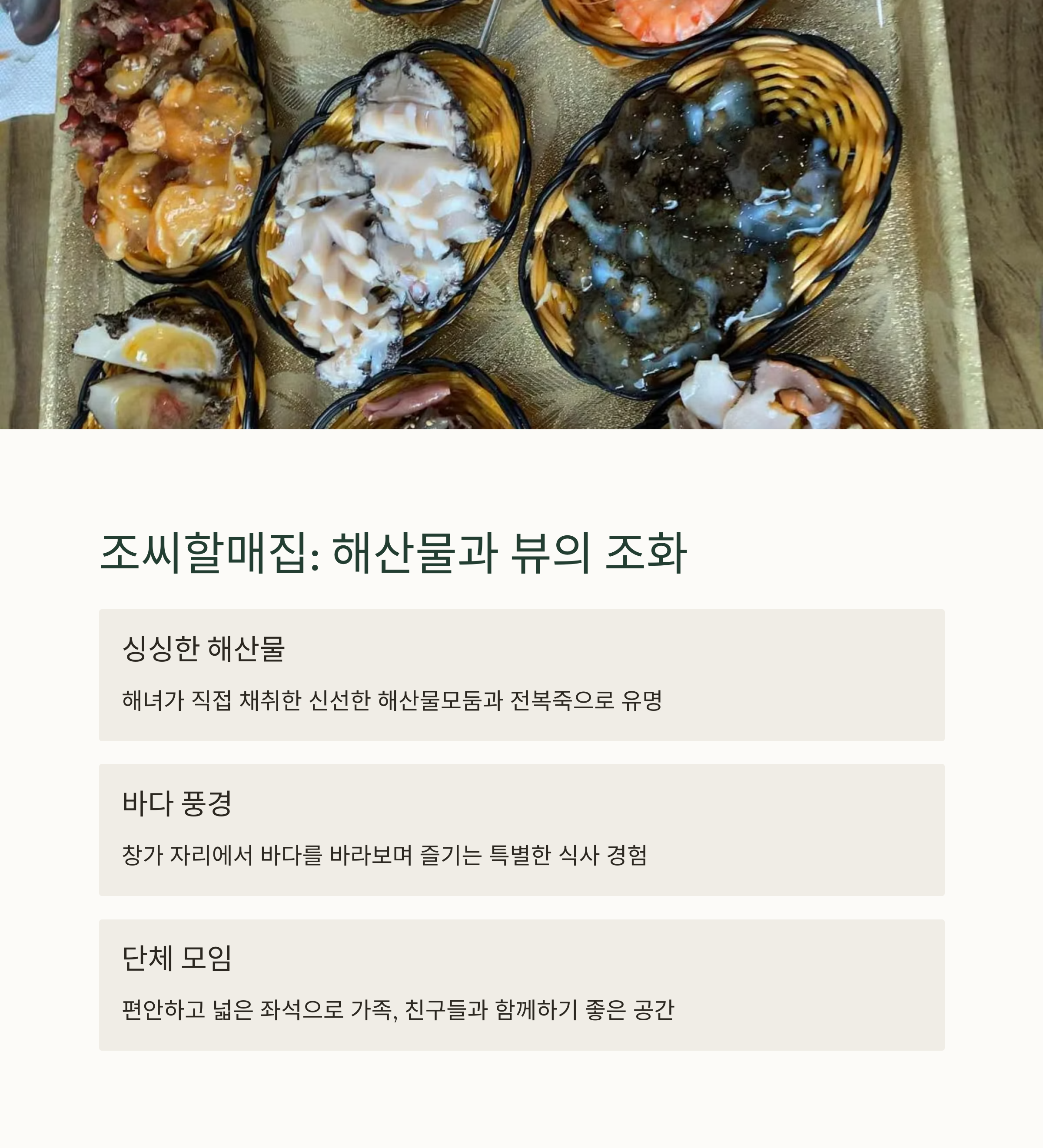 또 다른 인기 맛집은 ‘조씨할매집’으로, 바다 전망을 바라보며 식사가 가능한 바다뷰 좌석이 인상적입니다. 해산물모둠은 소(35,000원), 대(55,000원) 구성으로 전복, 소라, 해삼, 멍게 등 싱싱한 바다 재료를 한 상에 푸짐하게 맛볼 수 있어 현지인도 자주 찾는 곳이에요. 바다 향과 함께 먹는 전복죽은 여행 피로를 잊게 해주는 진정한 보양식입니다.