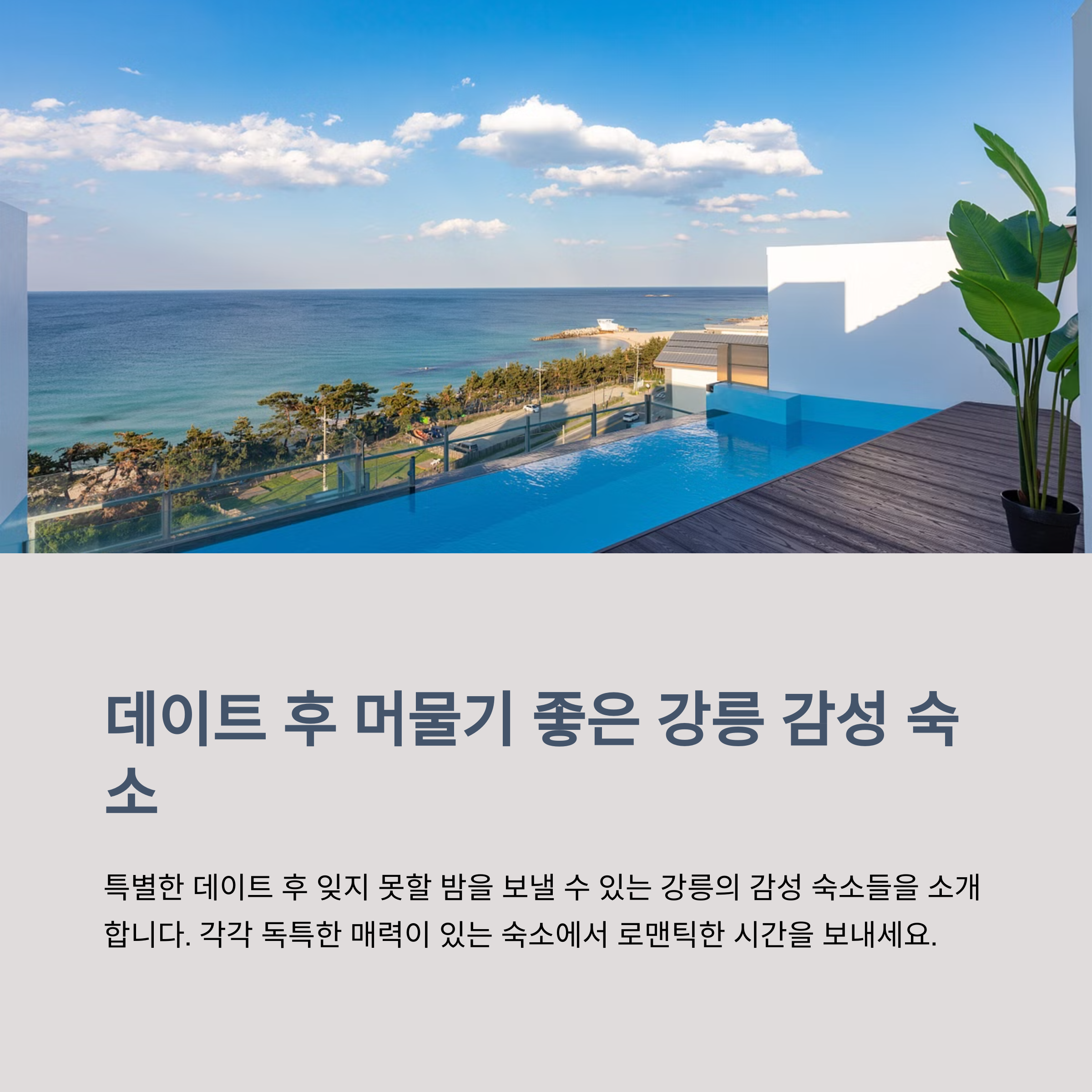 강릉은 바다와 자연, 감성이 모두 어우러진 도시로 커플들의 여행지로 꾸준히 사랑받고 있습니다. 강문해변에서의 산책, 바다를 바라보며 커피를 마시는 여유, 그리고 밤에는 감성적인 숙소에서 힐링까지 경험할 수 있어 하루의 여정을 특별하게 만들어줍니다. 오늘 소개해드린 코스를 통해 여러분의 데이트가 더 기억에 남는 하루가 되길 바랍니다. 사랑하는 사람과 함께 하는 시간만큼 소중한 것은 없으니까요.