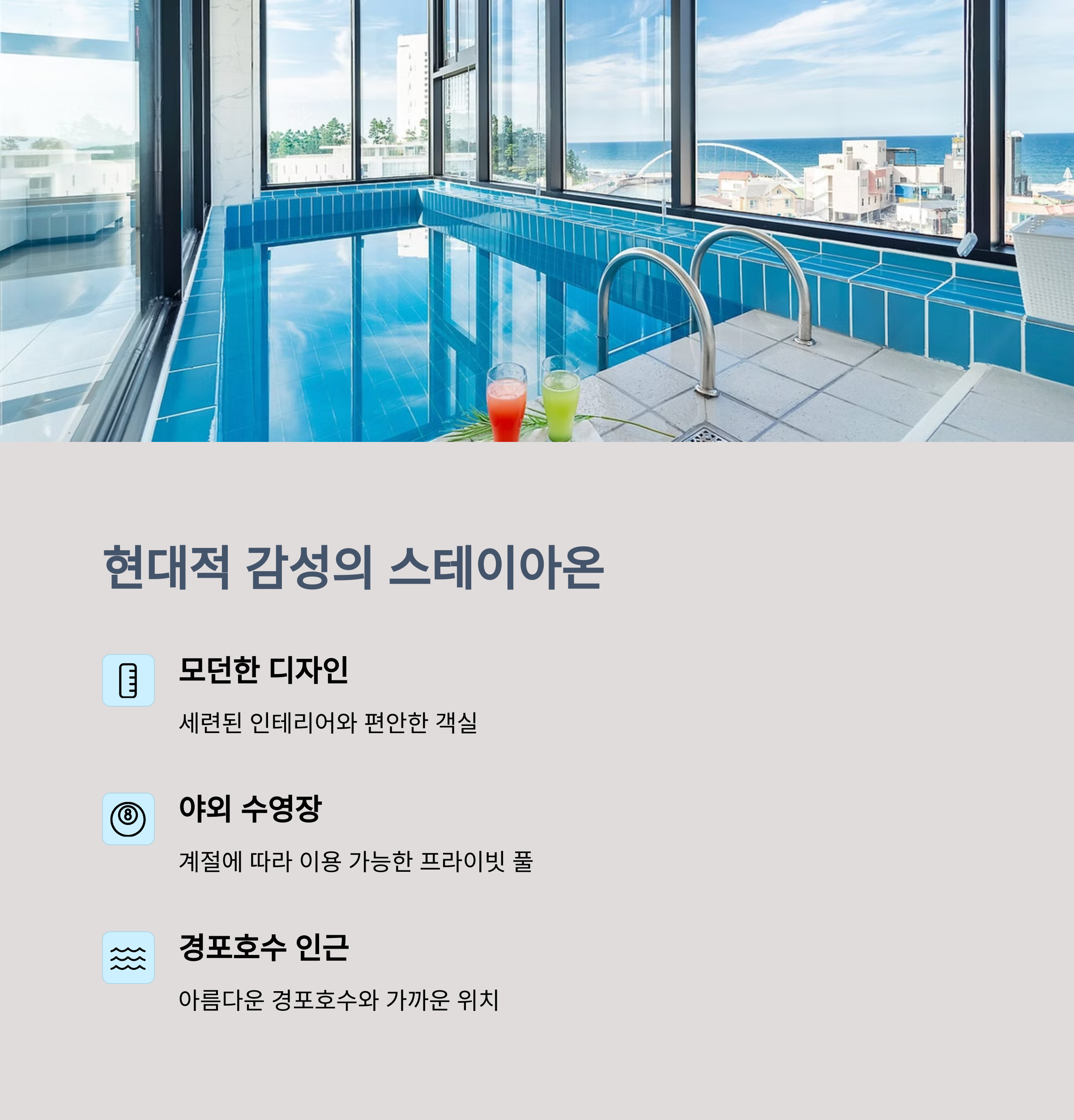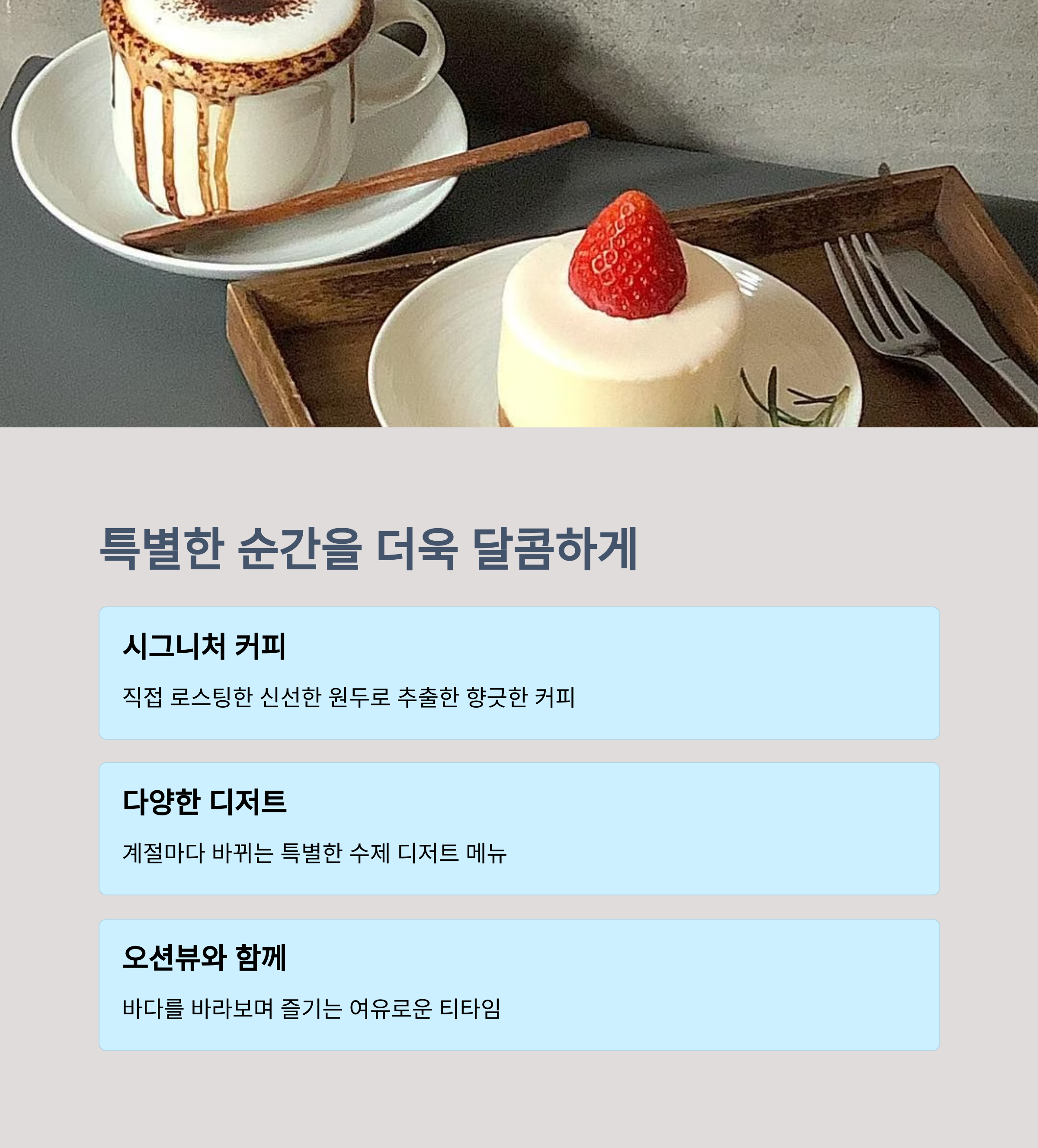 주차 편의성, 접근성 모두 우수 | 감성 인테리어, 편안한 휴식 공간 | 바다 – 커피 – 숙소 감성 루트 완성 |