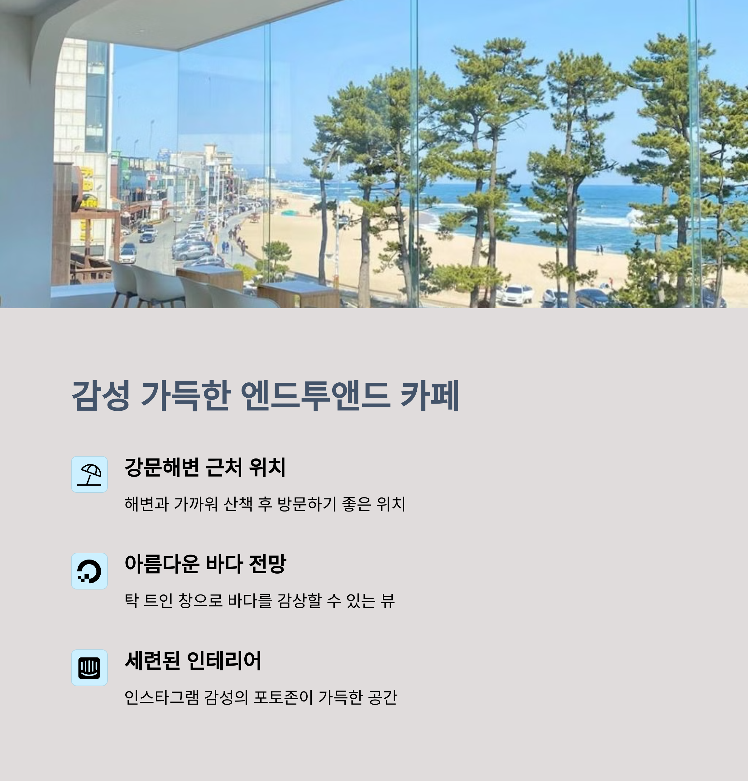 | 엔드투앤드에서 바라보는 해변 풍경 | 임영고택, 스테이아온, KN 하우스 추천 | 강문해변 – 카페 – 숙소 자연스러운 동선 |